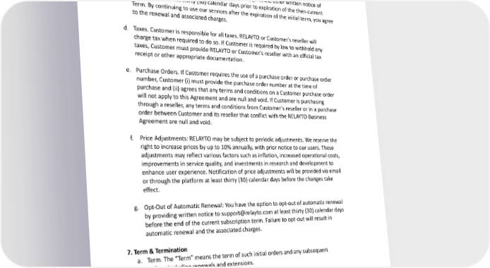 b. This Agreement is effective for the Period set forth in the accompanying invoice. 6c. Automatic Renewal c. Automatic Renewal. Each Term shall automatically renew for subsequent periods of the same length as the initial Term unless either party gives the other written notice of termination at least thirty (30) calendar days prior to expiration of the then-current Term. By continuing to use our services after the expiration of the initial term, you agree to the renewal and associated charges. d. Taxes. Customer is responsible for all taxes. RELAYTO or Customer's reseller will charge tax when required to do so. If Customer is required by law to withhold any taxes, Customer must provide RELAYTO or Customer's reseller with an official tax receipt or other appropriate documentation. e. Purchase Orders. If Customer requires the use of a purchase order or purchase order number, Customer (i) must provide the purchase order number at the time of purchase and (ii) agrees that any terms and conditions on a Customer purchase order will not apply to this Agreement and are null and void. If Customer is purchasing through a reseller, any terms and conditions from Customer's reseller or in a purchase order between Customer and its reseller that conflict with the RELAYTO Business Agreement are null and void. f. Price Adjustments: RELAYTO may be subject to periodic adjustments. We reserve the right to increase prices by up to 10% annually, with prior notice to our users. These adjustments may reflect various factors such as inflation, increased operational costs, improvements in service quality, and investments in research and development to enhance user experience. Notification of price adjustments will be provided via email or through the platform at least thirty (30) calendar days before the changes take effect. g. Opt-Out of Automatic Renewal: You have the option to opt-out of automatic renewal by providing written notice to [email protected] at least thirty (30) calendar days before the end of the current subscription term. Failure to opt-out will result in automatic renewal and the associated charges. 7. Term & Termination a. Term. The “Term” means the term of such initial orders and any subsequent orders, including renewals and extensions. b. Termination for Breach. Either RELAYTO or Customer may terminate this Agreement if (i) the other party is in material breach of the Agreement and fails to cure that breach within 30 calendar days after receipt of written notice or (ii) the other party ceases its business operations or becomes subject to insolvency proceedings and the proceedings are not dismissed within 90 calendar days. 6 of 53