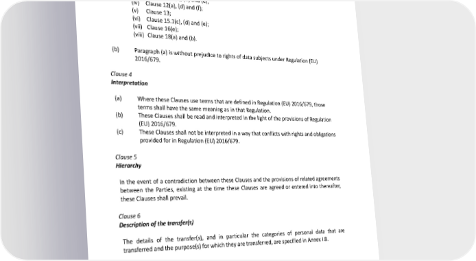 (a) Data subjects may invoke and enforce these Clauses, as third-party beneficiaries, against the data exporter and/or data importer, with the following exceptions: (i) Clause 1, Clause 2, Clause 3, Clause 6, Clause 7; (ii) Clause 8.1(b), 8.9(a), (c), (d) and (e); (iii) Clause 9(a), (c), (d) and (e); (iv) Clause 12(a), (d) and (f); (v) Clause 13; (vi) Clause 15.1(c), (d) and (e); (vii) Clause 16(e); (viii) Clause 18(a) and (b). (b) Paragraph (a) is without prejudice to rights of data subjects under Regulation (EU) 2016/679. Clause 4 Interpretation (a) Where these Clauses use terms that are defined in Regulation (EU) 2016/679, those terms shall have the same meaning as in that Regulation. (b) These Clauses shall be read and interpreted in the light of the provisions of Regulation (EU) 2016/679. (c) These Clauses shall not be interpreted in a way that conflicts with rights and obligations provided for in Regulation (EU) 2016/679. Clause 5 Hierarchy In the event of a contradiction between these Clauses and the provisions of related agreements between the Parties, existing at the time these Clauses are agreed or entered into thereafter, these Clauses shall prevail. Clause 6 Description of the transfer(s) The details of the transfer(s), and in particular the categories of personal data that are transferred and the purpose(s) for which they are transferred, are specified in Annex I.B. Clause 7 Docking clause (a) An entity that is not a Party to these Clauses may, with the agreement of the Parties, accede to these Clauses at any time, either as a data exporter or as a data importer, by completing the Appendix and signing Annex I.A. 23 of 53