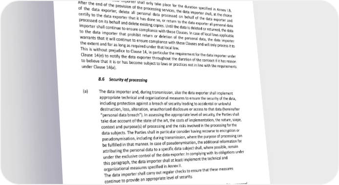 importer shall cooperate with the data exporter to erase or rectify the data. 8.5 Duration of processing and erasure or return of data Processing by the data importer shall only take place for the duration specified in Annex I.B. After the end of the provision of the processing services, the data importer shall, at the choice of the data exporter, delete all personal data processed on behalf of the data exporter and certify to the data exporter that it has done so, or return to the data exporter all personal data processed on its behalf and delete existing copies. Until the data is deleted or returned, the data importer shall continue to ensure compliance with these Clauses. In case of local laws applicable to the data importer that prohibit return or deletion of the personal data, the data importer warrants that it will continue to ensure compliance with these Clauses and will only process it to the extent and for as long as required under that local law. This is without prejudice to Clause 14, in particular the requirement for the data importer under Clause 14(e) to notify the data exporter throughout the duration of the contract if it has reason to believe that it is or has become subject to laws or practices not in line with the requirements under Clause 14(a). 8.6 Security of processing (a) The data importer and, during transmission, also the data exporter shall implement appropriate technical and organizational measures to ensure the security of the data, including protection against a breach of security leading to accidental or unlawful destruction, loss, alteration, unauthorized disclosure or access to that data (hereinafter “personal data breach”). In assessing the appropriate level of security, the Parties shall take due account of the state of the art, the costs of implementation, the nature, scope, context and purpose(s) of processing and the risks involved in the processing for the data subjects. The Parties shall in particular consider having recourse to encryption or pseudonymisation, including during transmission, where the purpose of processing can be fulfilled in that manner. In case of pseudonymisation, the additional information for attributing the personal data to a specific data subject shall, where possible, remain under the exclusive control of the data exporter. In complying with its obligations under this paragraph, the data importer shall at least implement the technical and organizational measures specified in Annex II. The data importer shall carry out regular checks to ensure that these measures continue to provide an appropriate level of security. (b) The data importer shall grant access to the personal data to members of its personnel only to the extent strictly necessary for the implementation, management and monitoring of the contract. It shall ensure that persons authorized to process the personal data have committed themselves to confidentiality or are under an appropriate statutory obligation of confidentiality. 25 of 53