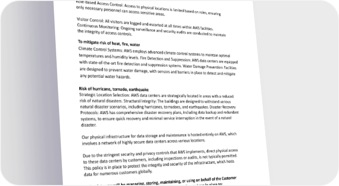 Compliance Standards: AWS data centers comply with various industry standards such as ISO 27001, SOC 1, SOC 2, and SOC 3, ensuring a high level of physical security and data protection. Strict Personnel Vetting: AWS implements a rigorous personnel screening process to ensure only trustworthy individuals have access. Role-Based Access Control: Access to physical locations is limited based on roles, ensuring only necessary personnel can access sensitive areas. Visitor Control: All visitors are logged and escorted at all times within AWS facilities. Continuous Monitoring: Ongoing surveillance and security audits are conducted to maintain the integrity of access controls. To mitigate risk of heat, fire, water Climate Control Systems: AWS employs advanced climate control systems to maintain optimal temperatures and humidity levels. Fire Detection and Suppression: AWS data centers are equipped with state-of-the-art fire detection and suppression systems. Water Damage Prevention: Facilities are designed to prevent water damage, with sensors and barriers in place to detect and mitigate any potential water hazards. Risk of hurricane, tornado, earthquake Strategic Location Selection: AWS data centers are strategically located in areas with a reduced risk of natural disasters. Structural Integrity: The buildings are designed to withstand various natural disaster scenarios, including hurricanes, tornadoes, and earthquakes. Disaster Recovery Protocols: AWS has comprehensive disaster recovery plans, including data backup and redundant systems, to ensure quick recovery and minimal service interruption in the event of a natural disaster. Our physical infrastructure for data storage and maintenance is hosted entirely on AWS, which involves a network of highly secure data centers across various locations. Due to the stringent security and privacy controls that AWS implements, direct physical access to these data centers by customers, including inspections or audits, is not typically permitted. This policy is in place to protect the integrity and security of the infrastructure, which hosts data for numerous customers globally. If the data you will be managing, storing, maintaining, or using on behalf of the Customer includes personally identifiable details, what provisions do you have in place to: ● Ensure compliance with European data privacy provisions (GDPR), as needed. ● Ensure compliance with data privacy provisions in other countries or regions. ● Ensure compliance with United States data breach laws (as needed, in those states where notification is required). 47 of 53