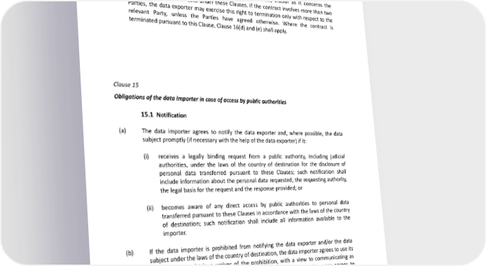 organizational measures to ensure security and confidentiality) to be adopted by the data exporter and/or data importer to address the situation. The data exporter shall suspend the data transfer if it considers that no appropriate safeguards for such transfer can be ensured, or if instructed by the competent supervisory authority to do so. In this case, the data exporter shall be entitled to terminate the contract, insofar as it concerns the processing of personal data under these Clauses. If the contract involves more than two Parties, the data exporter may exercise this right to termination only with respect to the relevant Party, unless the Parties have agreed otherwise. Where the contract is terminated pursuant to this Clause, Clause 16(d) and (e) shall apply. Clause 15 Obligations of the data importer in case of access by public authorities 15.1 Notification (a) The data importer agrees to notify the data exporter and, where possible, the data subject promptly (if necessary with the help of the data exporter) if it: (i) receives a legally binding request from a public authority, including judicial authorities, under the laws of the country of destination for the disclosure of personal data transferred pursuant to these Clauses; such notification shall include information about the personal data requested, the requesting authority, the legal basis for the request and the response provided; or (ii) becomes aware of any direct access by public authorities to personal data transferred pursuant to these Clauses in accordance with the laws of the country of destination; such notification shall include all information available to the importer. (b) If the data importer is prohibited from notifying the data exporter and/or the data subject under the laws of the country of destination, the data importer agrees to use its best efforts to obtain a waiver of the prohibition, with a view to communicating as much information as possible, as soon as possible. The data importer agrees to document its best efforts in order to be able to demonstrate them on request of the data exporter. (c) Where permissible under the laws of the country of destination, the data importer 33 of 53