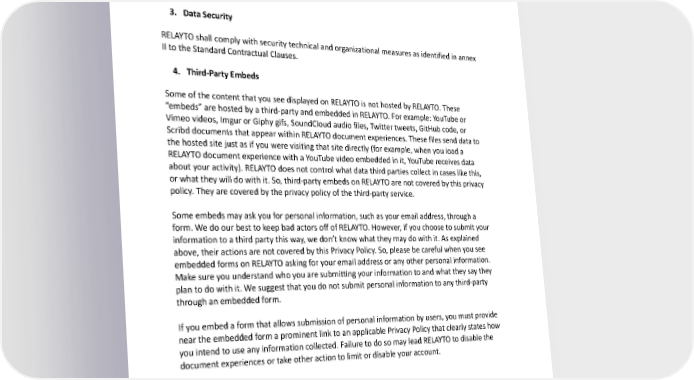 ● Be transparent, ● Fight blanket requests, ● Protect all users, and ● Provide trusted services. 3. Data Security RELAYTO shall comply with security technical and organizational measures as identified in annex II to the Standard Contractual Clauses. 4. Third-Party Embeds Some of the content that you see displayed on RELAYTO is not hosted by RELAYTO. These “embeds” are hosted by a third-party and embedded in RELAYTO. For example: YouTube or Vimeo videos, Imgur or Giphy gifs, SoundCloud audio files, Twitter tweets, GitHub code, or Scribd documents that appear within RELAYTO document experiences. These files send data to the hosted site just as if you were visiting that site directly (for example, when you load a RELAYTO document experience with a YouTube video embedded in it, YouTube receives data about your activity). RELAYTO does not control what data third parties collect in cases like this, or what they will do with it. So, third-party embeds on RELAYTO are not covered by this privacy policy. They are covered by the privacy policy of the third-party service. Some embeds may ask you for personal information, such as your email address, through a form. We do our best to keep bad actors off of RELAYTO. However, if you choose to submit your information to a third party this way, we don’t know what they may do with it. As explained above, their actions are not covered by this Privacy Policy. So, please be careful when you see embedded forms on RELAYTO asking for your email address or any other personal information. Make sure you understand who you are submitting your information to and what they say they plan to do with it. We suggest that you do not submit personal information to any third-party through an embedded form. If you embed a form that allows submission of personal information by users, you must provide near the embedded form a prominent link to an applicable Privacy Policy that clearly states how you intend to use any information collected. Failure to do so may lead RELAYTO to disable the document experiences or take other action to limit or disable your account. 5. Data Storage To provide you with the Services, we may store, process and transmit information in the United States and locations around the world - including those outside your country. Information may also be stored locally on the devices you use to access the Services. 12 of 53