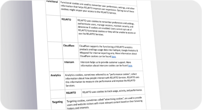 List of cookies used in RELAYTO Cookie Type Who Serves the Cookie? Cookie Information and Management Functional Functional cookies are used to remember user preferences, settings, and other information that helps RELAYTO improve user experience. Opting-out of these cookies might impair your access to the RELAYTO Service. RELAYTO RELAYTO uses cookies to remember preferences and settings, authenticate users, manage sessions, maintain security, and determine if cookies are enabled. Users cannot opt out of RELAYTO functional cookies or they will be unable to access or use the RELAYTO Services. Cloudflare Cloudflare supports the functioning of RELAYTO analytics products and logs usage data into HubSpot, Google Analytics & Mixpanel for internal reporting only. More Information about Cloudflare cookies can be found here. Intercom Intercom helps us to provide customer support. More information about Intercom cookies can be found here. Analytics Analytics cookies, sometimes referred to as “performance cookies”, collect information about how people interact with RELAYTO Services. RELAYTO uses this information to measure site performance and improve the RELAYTO Services. RELAYTO RELAYTO uses cookies to track usage, activity, and performance. Targeting Targeting cookies, sometimes called “advertising cookies”, are used to provide users and website visitors with more relevant content based on their browsing history and interests. NONE RELAYTO does not use targeting cookies in the RELAYTO web application. 50 of 53