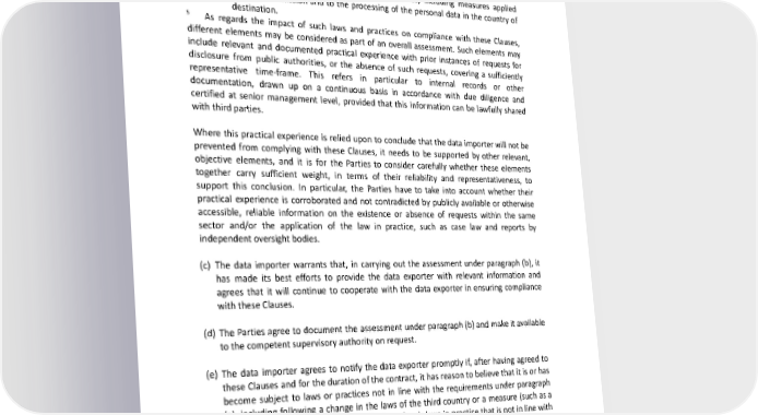 authorities – relevant in light of the specific circumstances of the transfer, and the applicable limitations and safeguards5; (iii) any relevant contractual, technical or organizational safeguards put in place to supplement the safeguards under these Clauses, including measures applied during transmission and to the processing of the personal data in the country of destination. 5 As regards the impact of such laws and practices on compliance with these Clauses, different elements may be considered as part of an overall assessment. Such elements may include relevant and documented practical experience with prior instances of requests for disclosure from public authorities, or the absence of such requests, covering a sufficiently representative time-frame. This refers in particular to internal records or other documentation, drawn up on a continuous basis in accordance with due diligence and certified at senior management level, provided that this information can be lawfully shared with third parties. Where this practical experience is relied upon to conclude that the data importer will not be prevented from complying with these Clauses, it needs to be supported by other relevant, objective elements, and it is for the Parties to consider carefully whether these elements together carry sufficient weight, in terms of their reliability and representativeness, to support this conclusion. In particular, the Parties have to take into account whether their practical experience is corroborated and not contradicted by publicly available or otherwise accessible, reliable information on the existence or absence of requests within the same sector and/or the application of the law in practice, such as case law and reports by independent oversight bodies. (c) The data importer warrants that, in carrying out the assessment under paragraph (b), it has made its best efforts to provide the data exporter with relevant information and agrees that it will continue to cooperate with the data exporter in ensuring compliance with these Clauses. (d) The Parties agree to document the assessment under paragraph (b) and make it available to the competent supervisory authority on request. (e) The data importer agrees to notify the data exporter promptly if, after having agreed to these Clauses and for the duration of the contract, it has reason to believe that it is or has become subject to laws or practices not in line with the requirements under paragraph (a), including following a change in the laws of the third country or a measure (such as a disclosure request) indicating an application of such laws in practice that is not in line with the requirements in paragraph (a). (f) Following a notification pursuant to paragraph (e), or if the data exporter otherwise has reason to believe that the data importer can no longer fulfill its obligations under these Clauses, the data exporter shall promptly identify appropriate measures (e.g. technical or 32 of 53