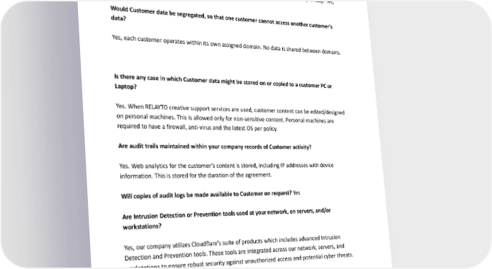 Is there a documented policy in place for hardening the operating system for web and other servers? Yes Are periodic security scans performed to determine if system vulnerabilities exist (i.e. ISS)? Yes, quarterly. Would Customer data be segregated, so that one customer cannot access another customer’s data? Yes, each customer operates within its own assigned domain. No data is shared between domains. Is there any case in which Customer data might be stored on or copied to a customer PC or Laptop? Yes. When RELAYTO creative support services are used, customer content can be edited/designed on personal machines. This is allowed only for non-sensitive content. Personal machines are required to have a firewall, anti-virus and the latest OS per policy. Are audit trails maintained within your company records of Customer activity? Yes. Web analytics for the customer’s content is stored, including IP addresses with device information. This is stored for the duration of the agreement. Will copies of audit logs be made available to Customer on request? Yes Are Intrusion Detection or Prevention tools used at your network, on servers, and/or workstations? Yes, our company utilizes Cloudflare's suite of products which includes advanced Intrusion Detection and Prevention tools. These tools are integrated across our network, servers, and workstations to ensure robust security against unauthorized access and potential cyber threats. Does your company have a computer incident or emergency response team with a formal process to respond to cyberattacks? 39 of 53