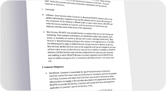 To the extent that Customer Data is subject to EU Data Protection Laws and is processed by RELAYTO as a data processor acting on Customer's behalf (as a data controller), RELAYTO will use and process such Customer Data as Customer instructs in order to provide the Services and fulfill RELAYTO's obligations under the Agreement. "Customer Data" means Stored Data and Account Data. "Stored Data" means the files and structured data submitted to the Services by Customer or End Users. "Account Data" means the account and contact information submitted to the Services by Customer or End Users. c. [removed] d. Software. Some Services allow Customers to download RELAYTO software which may update automatically. Customers may use the software only to access the Services. If any component of the software is offered under an open source license, RELAYTO will make the license available to Customer and the provisions of that license may expressly override some of the terms of this Agreement. e. Beta Services. RELAYTO may provide features or products that we are still testing and evaluating. These products and features are identified as alpha, beta, preview, early access, or evaluation (or words or phrases with similar meanings) (collectively, "Beta Services''). Notwithstanding anything to the contrary in this Agreement or in the DPA, the following terms apply to all Beta Services: (a) you may use or decline to use any Beta Services; (b) Beta Services may not be supported and may be changed at any time without notice to you; (c) Beta Services may not be as reliable or available as RELAYTO Business; (d) Beta Services have not been subjected to the same security measures and auditing to which RELAYTO Business has been subjected; and (e) RELAYTO will have no liability arising out of or in connection with beta services—use at your own risk. 2. Customer Obligations a. Compliance. Customer is responsible for use of the Services by its End Users. Customer and its End Users must use the Services in compliance with the Acceptable Use Policy. Customer will obtain from End Users any consents necessary to allow Administrators to engage in the activities described in this Agreement and to allow RELAYTO to provide the Services. Customer will comply with laws and regulations applicable to Customer's use of the Services, if any. b. Customer Administration of the Services. Customer may specify End Users as "Administrators" through the administrative console. Administrators may have the ability to access, disclose, restrict or remove Customer Data in or from Services accounts. Administrators may also have the ability to monitor, restrict, or terminate access to Services accounts. RELAYTO's responsibilities do not extend to the internal management or administration of the Services. Customer is responsible for: 3 of 53