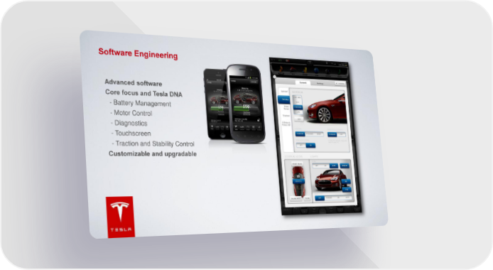 Software Engineering Advanced software Core focus and Tesla DNA - Battery Management - Motor Control - Diagnostics - Touchscreen - Traction and Stability Control Customizable and upgradable Tesla Page 28 Page 30