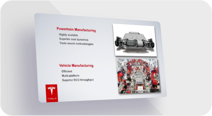 Powertrain Manufacturing Highly scalable Superior cost dynamics Trade secret methodologies Vehicle Manufacturing Efficient Multi-platform Superior ECO throughput Tesla Page 29 Page 31
