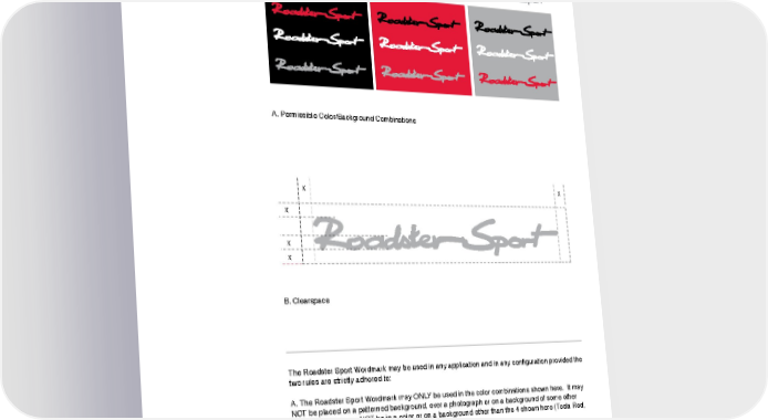 VISUAL IDENTITY ROADSTER SPORT A. Permissible Color/Background Combinations X X X X X B. Clearspace The Roadster Sport Wordmark may be used in any application and in any configuration provided the two rules are strictly adhered to: A. The Roadster Sport Wordmark may ONLY be used in the color combinations shown here. It may NOT be placed on a patterned background, over a photograph or on a background of some other color. The type may NOT be in a color or on a background other than the 4 shown here (Tesla Red, Tesla Black, or Tesla White) B. A clearspace equal to the vertical height of “a” in The Roadster Sport Wordmark must be maintained around The Roadster Sport Wordmark in every application. No other visual element may intrude within this clearspace. The Roadster Sport Wordmark may NOT be used “in-line” as part of headlines, copy or other typography, but should always be used as a stand-alone element. The Roadster Sport Wordmark may be given to third parties for use in their communications. Third parties must also abide by the rules outlined above. VISUAL IDENTITY 06