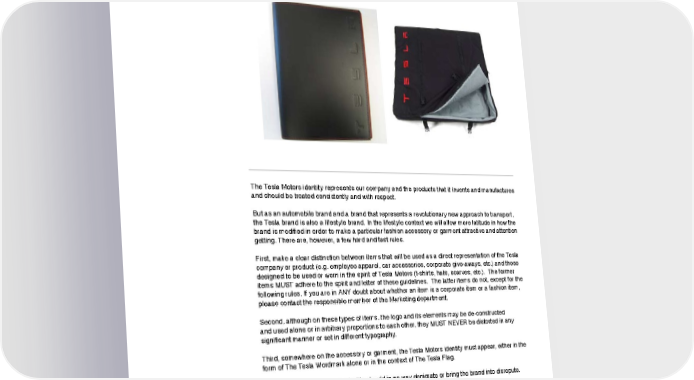 OTHER MERCHANDISE The Tesla Motors identity represents our company and the products that it invents and manufactures and should be treated consistently and with respect. But as an automobile brand and a brand that represents a revolutionary new approach to transport, the Tesla brand is also a lifestyle brand. In the lifestyle context we will allow more latitude in how the brand is modified in order to make a particular fashion accessory or garment attractive and attention getting. There are, however, a few hard and fast rules. First, make a clear distinction between items that will be used as a direct representation of the Tesla company or product (e.g. employee apparel, car accessories, corporate give-aways, etc.) and those designed to be used or worn in the spirit of Tesla Motors (t-shirts, hats, scarves, etc.). The former items MUST adhere to the spirit and letter of these guidelines. The latter items do not, except for the following rules. If you are in ANY doubt about whether an item is a corporate item or a fashion item, please contact the responsible member of the Marketing department. Second, although on these types of items, the logo and its elements may be de-constructed and used alone or in arbitrary proportions to each other, they MUST NEVER be distorted in any significant manner or set in different typography. Third, somewhere on the accessory or garment, the Tesla Motors identity must appear, either in the form of The Tesla Wordmark alone or in the context of The Tesla Flag. Fourth, the treatment of the identity should in no way denigrate or bring the brand into disrepute. Fifth, finally and most important, no accessory or garment design is to be put into production without the review and explicit approval of Corporate Marketing and the Chief Designer/Creative Director.. OTHER 01