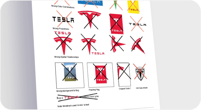 VISUAL IDENTITY UNACCEPTABLE USES OF THE VISUAL IDENTITY Wrong Color Combinations Wrong Proportions Wrong Spatial Relationships Wrong background to flag Floating Flag Cropped Tesla T Old Tesla Shield Buy a at a store near you Tesla Wordmark used “in-line” to text The exhibits above are some examples of ways in which the variations of the Tesla Visual Identity SHOULD NOT be used. This is by no means an exhaustive list, but it illustrates some of the most common issues. In particular, please make sure that the identity is also rendered in correct colors and position and is not distorted. It is also important to ensure that the identity has sufficient clearspace and bleeds correctly (in the case of The Tesla Flag) VISUAL IDENTITY 09