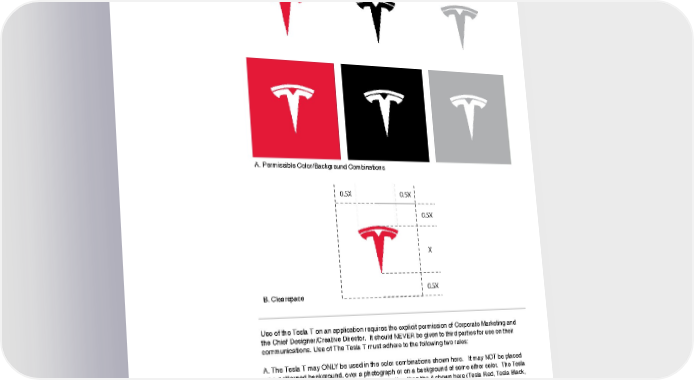 VISUAL IDENTITY TESLA T A. Permissible Color/Background Combinations 0.5X 0.5X 0.5X X 0.5X B. Clearspace Use of the Tesla T on an application requires the explicit permission of Corporate Marketing and the Chief Designer/Creative Director. It should NEVER be given to third parties for use on their communications. Use of The Tesla T must adhere to the following two rules: A. The Tesla T may ONLY be used in the color combinations shown here. It may NOT be placed on a patterned background, over a photograph or on a background of some other color. The Tesla T may NOT be in a color or on a background other than the 4 shown here (Tesla Red, Tesla Black, Tesla Gray or Tesla White) B. A clearspace equal to half of the horizontal width of The Tesla T must be maintained around The Tesla T in every application. No other visual element may intrude within this clearspace. C. The Tesla T must always be used in some degree of proximity to The Tesla Wordmark (either on the same visual plane or on the same object). It should never be used alone. Exceptions to this rule can only be made by Corporate Marketing and the Chief Designer/Creative Director. VISUAL IDENTITY 04