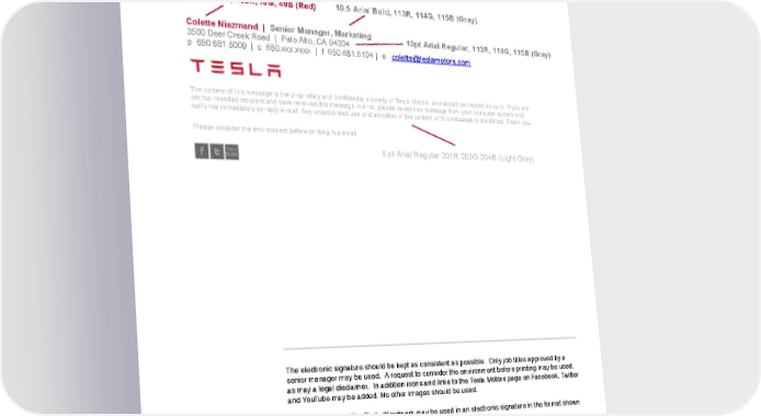 ELECTRONIC APPLICATIONS E-MAIL SIGNATURE 10.5pt. Arial Bold, 185R, 18G, 49B (Red) 10.5 Arial Bold, 113R, 114G, 115B (Gray) Colette Niazmand | Senior Manager, Marketing 10pt Arial Regular, 113R, 114G, 115B (Gray) 3500 Deer Creek Road | Palo Alto, CA 94304 p 650.681.5009 | c 650.xxx.xxxx | f 650.681.5104 | e [email protected] The content of this message is the proprietary and confidential property of Tesla Motors, and should be treated as such. If you are not the intended recipient and have received this message in error, please delete this message from your computer system and notify me immediately by reply e-mail. Any unauthorized use or distribution of the content of this message is prohibited. Thank you. Please consider the environment before printing this email. 8 pt Arial Regular 201R 203G 204B (Light Gray) The electronic signature should be kept as consistent as possible. Only job titles approved by a senior manager may be used. A request to consider the environment before printing may be used, as may a legal disclaimer. In addition icons and links to the Tesla Motors page on Facebook, Twitter and YouTube may be added. No other images should be used. In all cases, ONLY The Tesla Wordmark may be used in an electronic signature in the format shown above. NEVER use The Tesla Flag or The Tesla T. ELECTRONIC APPLICATIONS 02