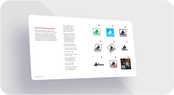 a. b. c. a. Do not use off-brand colors. In most cases, the logo LOGO CONSIDERATIONS should appear in either AAC White or AAC Black. (See A few rules are necessary for maintaining the page 6 for color specifics.) integrity of the brand as it applies to the Club logo. b. Do not alter the colors of the In general, do not compromise the overall look logo bounding box. When a of the logo by rotating, skewing, or distorting in bounding box is used, it must any way—this includes adding unnecessary and always appear in on-brand unattractive text decorations like drop shadows, colors (see page 6 for color embossing, and outlines. Here are a few examples specifics), most typically in d. e. f. of ways you should never consider using the logo. AAC White or AAC Black. c. Do not add drop shadows, embossing, or other text styles. d. Do not squish, stretch, skew, or otherwise transform the logo. e. Do not rotate the logo. f. Do not remove the bounding box from the logo. g. Do not rearrange parts or g. h. i. create compositions that are not already provided. h. Do not add unofficial graphics to the logo. i. Do not contain the logo within a bounding box when used on a photo background. AAC BRAND GUIDE 4