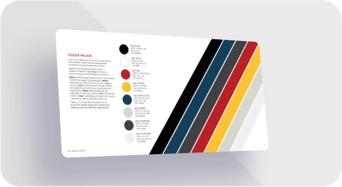 AAC BLACK CMYK: 73, 68, 67, 89 RGB: 3, 0, 0 HEX: 030000 COLOR PALATE AAC WHITE Color is an integral part of the AAC’s brand identity CMYK: 0, 0, 0, 0 and consistent use of the color palette serves RGB: 255, 255, 255 to reinforce the cohesiveness of the brand. HEX: ffffff Beyond branding standardization, color AAC RED serves an important psychological function in CMYK: 18, 100, 100, 10 communicating certain feelings to an audience. RGB: 178, 7, 16 Black denotes strength and authority; it is considered HEX: B20710 to be formal, elegant, and prestigious. White is AAC YELLOW associated with cleanliness and purity; it suggests CMYK: 2, 24, 90, 0 simplicity. Red is associated with strength, passion, RGB: 248, 194, 53 and leadership; an emotionally intense color with HEX: f8c235 high visibility. Yellow evokes energy, joy, and happiness; it produces a warming effect and attracts AAC INDIGO DYE attention. Blue is associated with depth and stability; CMYK: 84, 52, 24, 53 it symbolizes loyalty, confidence, and truth. RGB: 28, 57, 86 *Note: Cyan (C:100, M: 0, Y:0, K:0) (R:0, G:174, HEX: 1c3956 B:239) (HEX: 00aeef), though not a branded color should be used for all web links, when possible. AAC CREME CMYK: 15, 10, 18, 0 RGB: 223, 221, 208 HEX: dfddd0 AAC CHARCOAL CMYK: 0, 0, 0, 90 RGB: 65, 64, 66 HEX: 414042 AAC LIGHT GREY CMYK: 5, 3, 3, 0 RGB: 244, 244, 244 HEX: f4f4f4 AAC BRAND GUIDE 6