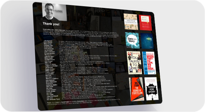 Thankyou! Good artists copy, great artists steal. But they steal gracefully. And with attribution. This collection of one pagers was inspired by the speeches, stories, ideas and insights that I’ve collected from some wonderful people who I’ve met along the way. This is not an exhaustive list of friends and colleagues who have inspired me (you know who you are and I love you), this is a list of people whose content has been gracefully stolen for some of my one pagers. I encourage you to buy their books and devour out EVERYTHING that they’ve published! Today Matters will change your life. John Maxwell My mentor who teaches me how to be a better leader. Nancy Duarte My favourite person in the industry. Helped me to understand the shape of a purpose-driven story. Simon Sinek If I had hero's Simon would be one of them. The person I look to most often for inspiration and ideas. Carmine Gallo I love everything he’s ever written. From Talk Like TED to Five Stars. Austin Kleon “The writer who draws”. Taught me to think with my pen. Chris Anderson Forever grateful for what he’s built at TED. Jay Heinrichs Taught me ab out the power of persuasion Louis J. Prosperi His Disney books about Imagineering are superb. Michael Margolis Story 10X should be on everyone’s bookshelf. Tim Grover Michael Jordan’s personal trainer taught me about obsession and what a winning mindset really looks like. John Elkington Inspired me to make sure every commercial deal has a triple bottom line. Blake Snyder Author of Save the Cat! There’s a reason every screen writer owns a copy. Caroline Goyder Voice, performance and presentation coach. Hire her. Nick Morgan Can You Hear Me? Helped me to be a better virtual presenter during lockdown. Sam Leith The best book on Rhetoric and understanding what Aristotle really meant. And he’s funny. Death by PowerPoint”. All his TED talks are must-sees. David J.P. Phillips Mr. “ Jonathan Gottschall The storytellers storyteller. Jon Favreau Obama’s former speech writer. Subscribe to the Crooked Media podcasts! Peggy Noonan Reagan’s former speech writer. On Speaking Well is another of those essential books. Philip Collins Blair’s former speech writer. His book When They Go Low, We Go High is outstanding. Yvette Cooper She Speaks. One of the few books showcasing the best women communicators. Donald Miller Story Brand was the initial inspiration behind the Communications Thinking framework. Bob Goff Love Wins. It really does. Will Storr Helped me to understand the “science” of storytelling on a much deeper level. Thomas L. Friedman My favourite columnist from the NY Times. He has 3 Pulitzer Prizes for a reason. Kate Raworth The Queen of Doughnut Economics. Superb TED speaker, author and economist. Erica Chenoweth Taught me all about the 3.5% rule and how a small group of people can change the world. Gary Keller The ONE Thing. One of those books I have to re-read every few months. Katharine Hayhoe The best climate communicator out there who taught me how to tell stories that matter. Seth Godin The King of Marketing. He’s never written a word I didn’t like.. Biz Stone Co-Founder of Twitter who taught me that you can “Build a business, change the world and have fun”. Garry Kasparov Chess grandmaster who helped me to talk about AI in a much more human way. Martin Brooks Author of Body Language Decoder. I recommend him for workshops or as a drinking partner. Rob Bell Poet. Preacher. Philosopher. One of the best communication coaches out there. Ken Segall Steve Jobs creative director. Who constantly reminds me not to over complicate things. John-Paul Flintoff Watch his Athens TEDx talk on changing the world and then go buy his books. Lisa Cron Wired For Story made me realise why the first sentence is EVERYTHING. Neil DeGrasse Tyson My favourite Masterclass host and probably the best dinner party guest anyone could ever have. Finally, much thanks to David Rogier for founding Masterclass.com (I have been obsessed since the platform was launched in May 2015 and it remains one of the few places I go to learn new things every day).