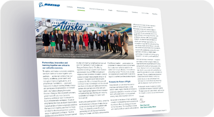 Nicola Sturgeon (center), Scotland’s first female First Minister and the first female leader of any of the devolved U.K. administrations, met with women attending the Boeing Innovation Forum after touring the ecoDemonstrator at Glasgow Airport. (Boeing photo) Partnerships, innovation and learning together are critical to our collective success. To explore and mature sustainable solutions, we must continue to work together with partners — across our communities, our industry, academia, governments and non-governmental organizations, and philanthropic foundations — given each have a role to play in tackling climate change and aerospace decarbonization. In October 2021, we hosted a Boeing Innovation Forum in Glasgow. We convened customers, government officials, manufacturers, academia and future talent to discuss the future of sustainable aerospace. It was an enlightening few days as expert stakeholders hosted panels on future sustainable solutions. Perhaps most inspiring was that this forum lent itself to diverse perspectives, given the range of participants and talent. The First Minister of Scotland Nicola Sturgeon opened the day with inspiring remarks and announced plans for The Newton Flight Academy at Glasgow Science Center. This Boeing- supported academy is used to teach students about aviation-related STEM concepts and inspire our next generation of leaders. Boeing’s ecoDemonstrator was a popular attraction at the event. The ecoDemonstrator program celebrates its 10th anniversary this year and continues to take technologies out of a lab and test them in the sky with airline and industry partners. It is perhaps one of the best and most visual representations of how innovation and partnerships are informing and maturing sustainable technologies for current and future aircraft. Boeing also participated in COP26, where the world convened to discuss climate change across all industries and on a global scale. There, the World Economic Forum, in partnership with US Special Presidential Envoy for Climate John Kerry, announced the First Movers Coalition — a new platform for companies to make purchasing commitments that create new market demand for low- carbon technologies. Boeing is honored to be a founding member. This is just one example of companies and governments collaborating together to advance and accelerate progress. Forward, the Future of Flight Going forward, we will remain focused on employee well-being and safety; global aviation safety; equity, diversity and inclusion; sustainable operations; innovation and clean tech; and global community engagement; among many other important elements. As we look to the future of flight, aerospace innovation is energized by how to decarbonize the industry. Boeing’s strategy is focused on four key areas. Continued fleet renewal with more fuel-efficient aircraft and operational efficiencies will remain critically important levers to reduce carbon emissions. Renewable energy will intersect aviation in new, exciting ways with the industrialization and growth of new sustainable aviation fuel (SAF) pathways, technology innovation, and production volumes. SAF and the parallel research, studies and demonstrations of electric and hydrogen applications, the renewable energy total life-cycle accounting, zero climate impact aircraft design concepts, safe certification and infrastructure implications, coupled with a sustainable product life-cycle approach, will drive our industry talent, partnerships, innovation and policies going forward. It is an exciting era for aerospace. These are ambitious challenges. Throughout our industry and our company history, we have had the resolve and teamwork to bring jet travel to the world and take people to the moon. We must continue to help humanity take flight in every sense while protecting our planet for generations to come. As Bill Boeing also said, “We are embarked as pioneers on a new science and industry in which our problems are so new and unusual that it behooves no one to dismiss any novel idea with the statement that ‘It can’t be done!’” In that spirit, we are on a journey to solve sustainable aerospace challenges together. We appreciate our stakeholders’ partnership for shared successes as we move forward. Onward, Chris Raymond Chief Sustainability Officer 2022 Sustainability Report 6 Contents People Introduction Communities Operations Reporting Approach & Governance Products & Services