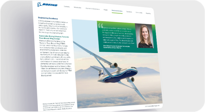 Engineering Excellence A strong engineering foundation enables us to build and maintain our products with safety, quality, integrity and sustainability in the factory and in service. Our customers expect it. That’s why we will always take the time to get the engineering right. Sustainable: Boeing Advances Transonic Truss-Braced Wing Concept Boeing is advancing the design of the Transonic Truss-Braced Wing (TTBW) concept, which has the potential to make future airplanes more aerodynamic and environmentally sustainable. Under this configuration, fuel efficiency is estimated to improve by 9%. It is also designed to offer unprecedented aerodynamic efficiency while flying at Mach 0.80 — consistent with the current speed of commercial air travel. In partnership with NASA under the Sustainable Flight Demonstrator and the Subsonic Ultra Green Aircraft Research programs, Boeing is continuing to research and develop the TTBW concept before it is evaluated for future Boeing aircraft. Boeing is studying the Transonic Truss-Braced Wing concept, designed to be more aerodynamic and fuel efficient, through a collaboration with NASA as part of the Subsonic Ultra Green Aircraft Research program. (Boeing illustration) Engineers are problem solvers at heart. We are partnering across our industry to tackle one of the biggest challenges of our time, decarbonizing aerospace. Many people are really passionate and energized by this challenge and it inspires me daily to be a part of that. The determination and collaboration of many is what we need to get there.” Ellen Ebner, Director, Sustainable Technologies, Sustainability & Future Mobility 2022 Sustainability Report 35 Contents People Introduction Communities Operations Reporting Approach & Governance Products & Services