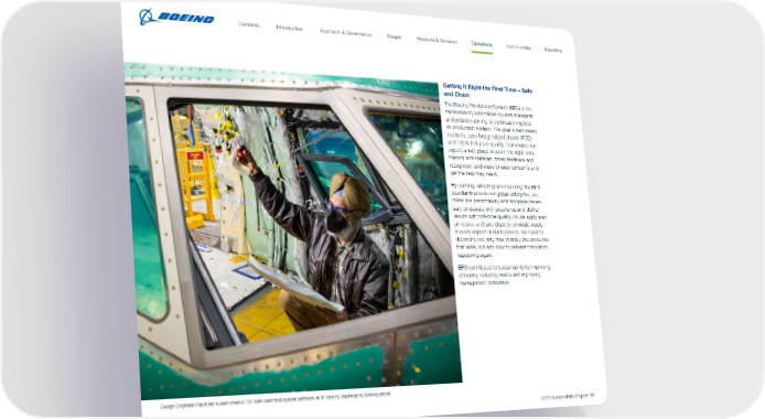 Design Engineer Rupinder Aulakh checks 737 MAX electrical system architecture in Renton, Washington. (Boeing photo) Getting it Right the First Time – Safe and Clean The Boeing Production System (BPS) is the framework by which Boeing uses standards and problem solving to continually improve its production system. The goal is zero safety incidents, zero foreign object debris (FOD) and 100% first-pass quality. Teammates can expect a safe place to work, the right tools, training and materials, timely feedback and recognition, and ways to raise concerns and get the help they need. By learning, adopting and maturing the BPS standards across our global enterprise, we foster the predictability and discipline neces - sary to operate with excellence and deliver results with first-time quality. As we apply lean principles and take steps to eliminate waste in every aspect of our business, we need to determine not only how to solve the problems that arise, but also how to prevent them from happening again. BPS contributes to sustainability by improving efficiency, reducing waste and improving management processes. 2022 Sustainability Report 50 Contents People Introduction Communities Operations Reporting Approach & Governance Products & Services