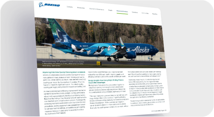 Inkjet-printing technology, still in development, created this test case orca livery for Alaska Airlines, demonstrating a promising, efficient and environmentally friendly process. (Boeing photo) Improving First-Time Quality: Cracking Down on Defects Welding is a fabrication process used to fuse together two or more parts with heat, pressure or both, forming a join as the parts cool. When welding aluminum, heat affected zone (HAZ) cracking can occur due to a number of variables. When this happens, it leads to significant rework. This affects quality, causing part supply and production impacts and adding cost. A cross-functional team of Boeing engineers and mechanics wanted to tackle this chronic problem, so they performed a robust root-cause analysis to identify all contributing factors. Based on the findings, they documented and implemented a new standard work and procedures process. Subsequently, all Boeing mechanics and welders were trained on the new procedures, welding equipment was evaluated and tested to optimize machine settings, and additional part-cleaning measures were put in place prior to assembly to reduce the likelihood of HAZ defects. Thanks to this committed team, HAZ cracking has been reduced by over 35% each month, improving quality and efficiency and saving tens of thousands of dollars per month. Design Insights: New Livery Inkjet-Printing Process Could Offer Advantages Boeing teams from across the globe worked together to adapt inkjet-printing technology to create photorealistic airplane liveries by precisely applying billions of dots of ink to curved surfaces using a rotatable, eight-axis print head. “This new inkjet printing process takes our aircraft livery and image-design efforts to the next level,” said Chip Frohlich, Director of Advanced Manufacturing for Commercial Airplanes Product Development. “If the customer can imagine it, we will be able to deliver it — from solid colors to photos. Eventually, we could operate it similarly to a car wash, without the multiple passes and cure cycles needed with traditional paint. Not only can the results be far more creative, but we also will have faster turnaround times and reduced costs.” Traditionally, it takes three to 12 production days to paint liveries. With inkjet printing, the time required for image application will be reduced to just a couple of days, even for complex designs, plus safety is improved by minimizing work at heights. It also provides better aerodynamics in flight, thanks to the elimination of paint steps and edges. In addition, with the reduction of up to 100 pounds (45 kilograms) of weight resulting from multiple paint layers being replaced by a single thin layer of ink, fuel efficiency is enhanced. The technology is still in development and is not yet available to customers, but is showing great promise as a simpler and more environmentally preferred process. 2022 Sustainability Report 36 Contents People Introduction Communities Operations Reporting Approach & Governance Products & Services
