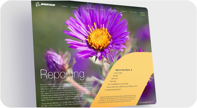Reporting This Sustainability Report has been prepared in accordance with the GRI Standards: Core Option. The GRI Index on the following page indicates the location of each GRI disclosure within this Sustainability Report, on our external website or other Boeing reports, or it states the information directly. In the SASB Index and TCFD Index, we have aligned our disclosures with the recommended disclosures and metrics in the SASB Aerospace & Defense Standard and the TCFD framework. We will continue to evaluate our disclosure approach moving forward to ensure we are providing relevant information in an efficient and effective manner. All data within Key ESG Data and the GRI, SASB and TCFD indexes is for the period from Jan. 1, 2021, through Dec. 31, 2021, unless otherwise noted. Section Key Topics Key ESG Data GRI Index SASB Index TCFD Index U.N. Sustainable Development Goals Awards and Recognition/Memberships and Partnerships Forward-Looking Statements Boeing worked with local community stakeholders to create the Pollinator Prairie in Olathe, near Kansas City, Kansas, as part of its cleanup effort at the former Chemical Commodities Inc. site. The habitat consists of mostly native plants that provide bees, birds and butterflies food, shelter and safe areas for breeding. (Boeing photo) 2022 Sustainability Report 67 Contents People Introduction Communities Operations Approach & Governance Products & Services Reporting