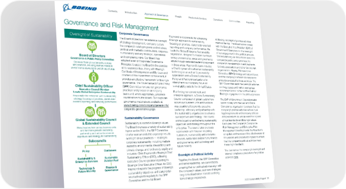 Governance and Risk Management Corporate Governance The Board of Directors has extensive oversight of strategy development, company culture, the company’s safety programs and initiatives, political and charitable contributions, corporate sustainability and key strategic, operational and compliance risks. Our Board has adopted a set of Corporate Governance Principles to assist the Board in the exercise of its responsibilities. Along with Boeing’s Certificate of Incorporation and By-Laws and charters of the committees of the Board, it provides an effective framework for Boeing’s governance. The Governance & Public Policy (GPP) Committee reviews our governance practices and policies on an ongoing basis and, where appropriate, proposes modifications to the Board. Our corporate governance materials are available at www.boeing.com/company/general-info/ corporate-governance.page . Sustainability Governance Sustainability is rooted in Boeing’s values. The Board oversees a variety of sustainability topics and in 2021, the GPP Committee charter was amended to expressly include oversight of our practices — relating to corporate sustainability, including matters related to environmental stewardship and climate change, and to diversity, equity and inclusion. Chris Raymond is Boeing’s Chief Sustainability Officer (CSO), a Boeing Executive Council position reporting to Boeing’s Chief Executive Officer. As CSO, Raymond reports the progress of Boeing’s sustainability objectives and stakeholder- oriented reports regularly to the GPP Committee and the full Board. Raymond is responsible for advancing Boeing’s approach to sustainability, focusing on priorities, stakeholder-oriented reporting and company performance. He leads the Global Enterprise Sustainability organization, designed to sharpen our focus on key environmental, social and governance efforts through dedicated leadership alignment in these areas. Raymond’s team includes a Chief Engineer who advances sustainability technologies as well as future mobility applications and a Global Sustainability Policy and Partnerships leader who strengthens our company focus on sustainability outside the United States. Reinforcing our commitment and enterprise approach, a Global Sustainability Council composed of global leaders from across our business units and functions was established to provide executive leadership, advocacy and partnership with the sustainability organization to advance our objectives and strategy. This council works to partner and advance sustainability objectives and strategy throughout the enterprise. The council also oversees subcouncils with focuses on policy, customers, sustainability and enterprise services, sustainable aviation fuels, finance and governance, and technology and future mobility. Oversight of Political Activity Together, the Board, the GPP Committee and senior leadership, are committed to ensuring that our political activities align with the company’s values, business strategies, long-term shareholder interests and long- term strategic imperatives. At Boeing, oversight of political activities starts at the top. The Board works closely with the Executive Vice President (EVP) of Government Operations on the oversight of our engagement in the political process. This includes regular discussions about the company’s public policy priorities; the company’s memberships in and payments to trade associations and other tax-exempt organizations; Boeing Political Action Committee (BPAC) strategy and expenditures; and the company’s network of compliance procedures related to these activities. The GPP Committee leads the oversight activities on these issues and makes appropriate recommendations to the full Board about Boeing’s engagement in the political process. The EVP of Government Operations also works closely with the Law and Global Compliance organization to ensure that the company’s political activities adhere to all legal requirements and company policies and procedures as well as meet the highest ethical standards and Boeing’s values. Each year, the Company’s Compliance Risk Management and Enterprise Risk Management boards provide the Board with an update and overview of the effectiveness of the policies and procedures in place to ensure that the company’s political activities meet these high standards. You can review the company’s oversight and internal compliance procedures for political activities here . Oversight of Sustainability Board of Directors Governance & Public Policy Committee Oversees Boeing’s sustainability policies and practices, including matters related to environmental stewardship and climate change Subcouncils Chief Sustainability Ofcer Executive Council Member Leads Global Enterprise Sustainability Responsible for enterprise-wide sustainability strategy, focusing on priorities, stakeholder- oriented reporting and company performance Global Sustainability Council & Extended Council Global leaders from across business units and functions provide leadership, partnership and action to advance objectives and strategy for sustainability Technology & Future Mobility Finance & Governance Policy Sustainability & Enterprise Services Customers Sustainable Aviation Fuel 2022 Sustainability Report 15 Contents People Introduction Communities Operations Reporting Approach & Governance Products & Services