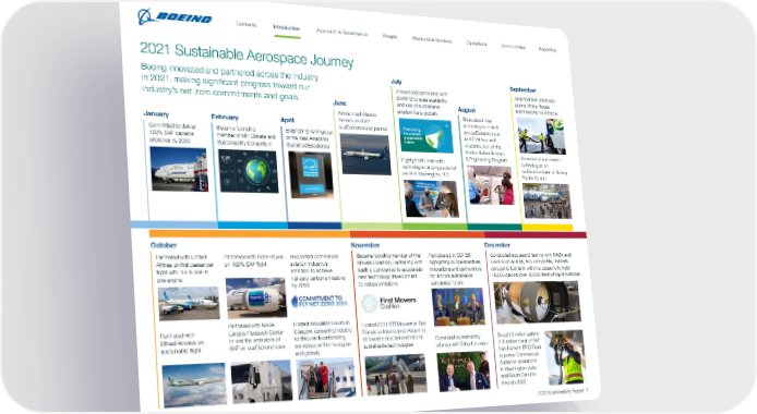 2021 Sustainable Aerospace Journey Boeing innovated and partnered across the industry in 2021, making significant progress toward our industry’s net-zero commitments and goals. January Committed to deliver 100% SAF capable airplanes by 2030 February Became founding member of MIT Climate and Sustainability Consortium April ENERGY STAR Partner of the Year Award for Sustained Excellence [ Insert Custom Partner Te xt ] June Announced Alaska Airlines as 2021 ecoDemonstrator partner July Announced partnership with SkyNRG to scale availability and use of sustainable aviation fuels globally Highlighted sustainable technologies at congressional event in Washington, D.C. August Showcased new technologies tested on ecoDemonstrator to STEM-focused students, part of the Alaska Native Science & Engineering Program September Amplified SAF ambitions during White House sustainability roundtable Showcased sustainable technologies on ecoDemonstrator at Boeing Field in Seattle October Partnered with United Airlines on first passenger flight with 100% SAF in one engine Partnered with Etihad Airways on sustainable flight Partnered with Rolls-Royce on 100% SAF flight Partnered with NASA Langley Research Center to test the emissions of SAF on ecoDemonstrator Supported commercial aviation industry’s ambition to achieve net-zero carbon emissions by 2050 Hosted Innovation Forum in Glasgow, convening industry to discuss decarbonizing aerospace within the region and globally November Became founding member of First Movers Coalition, partnering with leading companies to accelerate new technology development to reduce emissions Hosted 2021 STEM event at San Francisco International Airport to showcase ecoDemonstrator’s sustainable technologies Participated in COP26, highlighting our perspectives, innovations and partnerships for a more sustainable aerospace future Expanded sustainability alliance with Etihad Airways December Conducted successful testing with NASA and DARPA on a large, fully composite, linerless cryogenic fuel tank with the capacity to hold 16,000 gallons (over 60,500 liters) of liquid hydrogen Bought 2 million gallons (7.6 million liters) of SAF blended with EPIC Fuels to power Commercial Airplanes operations in Washington state and South Carolina through 2022 2022 Sustainability Report 7 Contents People Introduction Communities Operations Reporting Approach & Governance Products & Services