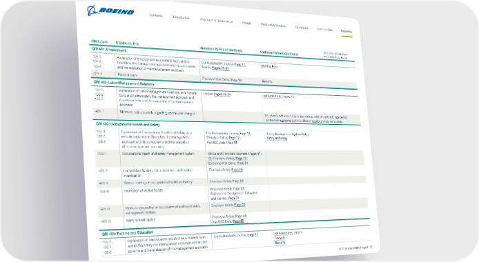 Disclosure Disclosure Title Sustainability Report Section(s) Additional Reference(s)/Link(s) GRI 401: Employment 103-1, 103-2, 103-3 Explanation of Employment as a material topic and its Boundary, the management approach and its components and the evaluation of the management approach Our Sustainability Journey, Page 11 ; People, Pages 21-31 Working Here 401-3 Parental leave Employee Well-Being, Page 24 Benefits GRI 402: Labor/Management Relations 103-1, 103-2, 103-3 Explanation of Labor/Management Relations as a material topic and its Boundary, the management approach and its components and the evaluation of the management approach People, Pages 21-31 AR Form 10-K , Pages 2-4 402-1 Minimum notice periods regarding operational changes We provide advance notice in accordance with all applicable legal and/or contractual requirements in the different locations where we operate. GRI 403: Occupational Health and Safety 103-1, 103-2, 103-3 Explanation of Occupational Health and Safety as a material topic and its Boundary, the management approach and its components and the evaluation of the management approach Our Sustainability Journey, Page 11 ; Employee Safety, Page 23 ; Key ESG Data, Page 68 Safety Management System Policy Safety at Boeing 403-1 Occupational health and safety management system Ethical and Compliant Business, Pages 17- 20 ; Employee Safety, Page 23 ; Employee Well-Being, Page 24 403-2 Hazard identification, risk assessment and incident investigation Employee Safety, Page 23 403-5 Worker training on occupational health and safety Employee Safety, Page 23 403-6 Promotion of worker health Employee Safety, Page 23 ; Professional Development, Education and Training, Page 31 403-8 Workers covered by an occupational health and safety management system Employee Safety, Page 23 403-9 Work-related injuries Employee Safety, Page 23 ; Key ESG Data, Page 68 GRI 404: Training and Education 103-1, 103-2, 103-3 Explanation of Training and Education as a material topic and its Boundary, the management approach and its com - ponents and the evaluation of the management approach Our Sustainability Journey, Page 11 AR Form 10-K , Page 3 Careers Benefits AR = 2021 Annual Report PR = 2022 Proxy Report 2022 Sustainability Report 79 Contents People Introduction Communities Operations Reporting Approach & Governance Products & Services