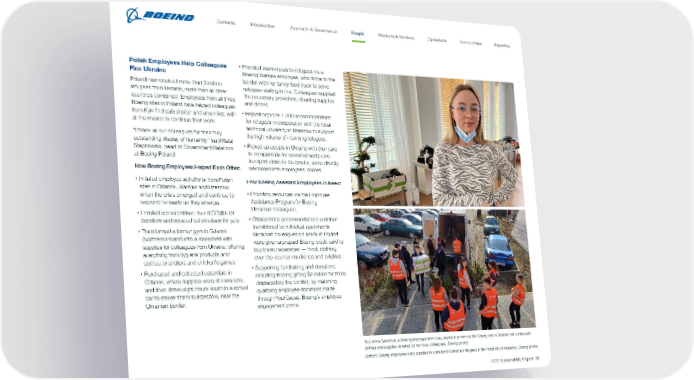 Polish Employees Help Colleagues Flee Ukraine Poland has received more than 3 million refugees from Ukraine, more than all other countries combined. Employees from all three Boeing sites in Poland have helped colleagues from Kyiv find safe shelter and amenities, with all the means to continue their work. “I thank all our colleagues for their truly outstanding display of humanity,” said Rafal Stepnowski, head of Government Relations at Boeing Poland. How Boeing Employees Helped Each Other: • Initiated employee aid efforts from Polish sites in Gdansk, Warsaw and Rzeszow when the crisis emerged and continue to respond to needs as they emerge. • Enrolled schoolchildren, found COVID-19 boosters and sourced veterinarians for pets. • Transformed a former gym in Gdansk (Northern Poland) into a room filled with supplies for colleagues from Ukraine, offering everything from hygiene products and clothes to strollers and children ’ s games. • Purchased and collected essentials in Gdansk, where supplies were still available, and then drove eight hours south in a rented car to deliver them to Rzeszów, near the Ukrainian border. • Provided warm meals to refugees via a Boeing Warsaw employee, who drove to the border with her family food truck to serve refugees waiting in line. Colleagues supplied the necessary provisions, cleaning supplies and dishes. • Helped organize 1,000 accommodations for refugees in cooperation with the local technical university in Rzeszow to support the high volume of incoming refugees. • Picked up people in Ukraine with their cars to compensate for overwhelmed public transport close to the border, some directly welcomed into employees’ homes. How Boeing Assisted Employees in Need: • Providing resources via the Employee Assistance Program for Boeing Ukrainian colleagues. • Offered hotel accommodations and then transitioned to individual apartments. Ukrainian colleagues on arrival in Poland were given a prepaid Boeing credit card to buy basic necessities — food, clothing, over-the-counter medicines and toiletries. • Supporting fundraising and donations, including Boeing gifting $2 million for those displaced by the conflict, by matching qualifying employee donations made through YourCause, Boeing’s employee engagement portal. Top: Anna Samchuk, a Boeing employee from Kyiv, stands in a room at the Boeing site in Gdansk that is filled with clothes and supplies donated by her local colleagues. (Boeing photo) Bottom: Boeing employees carry supplies to a shelter for Ukrainian refugees in the Polish city of Rzeszów. (Boeing photo) 2022 Sustainability Report 26 Contents People Introduction Communities Operations Reporting Approach & Governance Products & Services