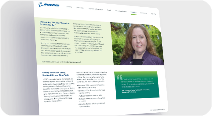 Championing This Idea: ‘Commit to Do What You Can’ Environmental scientist Kristin Marshall is Boeing ’ s 2021 Environment Champion, an annual award given to an employee who exemplifies leadership by improving environmental performance and inspiring others to do the same. Throughout her career, Marshall has been inspired by one of President Theodore Roosevelt’s favorite sayings: “Do what you can, with what you’ve got, where you are.” She encourages everyone at Boeing to act to ensure environmental sustainability. Some examples of Marshall’s environmental commitment include leading the installation of an award-winning rain garden and working with a team to implement automated environmental monitoring at paint booths. “Many of the sustainability and environmental challenges we face are definitely huge in scale, but everyone at Boeing can — and should — contribute to the solution,” Marshall said. “You can figure out what single action you are going to take with the options you have and take action today, tomorrow and in the future.” Kristin Marshall, Boeing’s 2021 Environment Champion (Boeing photo) Shining a Focus on Safety, Sustainability and Clean Tools In 2021, motivated teams of engineers and technical experts advanced the safety and sustainability of automated laser tool cleaning, earning a Boeing Technical Replication Award for their efforts. Employees at Boeing Auburn in Washington pioneered the work, while the Composite Wing Center in Everett, Washington, advanced the concept and colleagues at Boeing Canada Winnipeg expanded it even further. Conventional tool cleaning uses manual sanders or chemical processing, which adds ergonomic, safety and environmental concerns. Laser ablation nearly eliminates those risks. The teams’ solution has the following benefits: • Eliminates 100% of ergonomic/repetitive risks from manual sanding • Removes 100% of hazardous chemicals from de-painting • Reduces hazardous waste by 90% • Reduces worker exposure to hazardous chemicals • Reduces damage to tooling as a result of oversanding We implemented this technique on tools to get our arms around how to use lasers in a manufacturing setting. Once we gained confidence, we graduated to other aircraft applications.” Kay Blohowiak, Senior Technical Fellow, Boeing Research & Technology 2022 Sustainability Report 57 Contents People Introduction Communities Operations Reporting Approach & Governance Products & Services