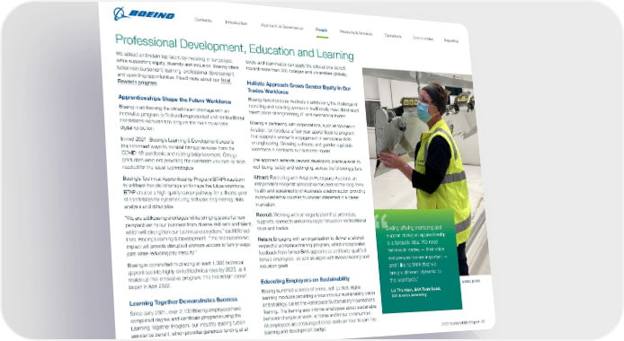 Professional Development, Education and Learning We attract and retain top talent by investing in our people, while supporting equity, diversity and inclusion. Boeing offers tuition reimbursement, learning, professional development and upskilling opportunities. Read more about our Total Rewards program . Apprenticeships Shape the Future Workforce Boeing is addressing the skilled-talent shortage with an innovative program to find underrepresented and nontraditional candidates motivated to acquire the skills to win the digital revolution. In mid-2021, Boeing’s Learning & Development experts brainstormed ways to combat hiring pressures from the COVID-19 pandemic and retiring baby boomers. College graduates were not providing the candidate volumes or skills needed for the latest technologies. Boeing’s Technical Apprenticeship Program (BTAP) was born to address this skill shortage and shape the future workforce. BTAP creates a high-quality career pathway for a diverse pool of candidates for cybersecurity, software engineering, data analysis and other jobs. “We are addressing shortages while bringing powerful new perspectives to our business from diverse skill sets and talent, which will strengthen our technical ecosystem,” said Michael Fors, Boeing Learning & Development. “The socioeconomic impact will provide disrupted workers access to family-wage jobs while reducing pay inequity.” Boeing is committed to placing at least 1,000 technical apprentices into highly-skilled technical roles by 2025, as it scales up this innovative program. The first BTAP cohort began in April 2022. Learning Together Demonstrates Success Since early 2021, over 2,100 Boeing employees have completed degree and certificate programs using the Learning Together Program, our industry leading tuition assistance benefit, which provides generous funding at all levels and teammates can apply the educational benefit toward more than 300 colleges and universities globally. Holistic Approach Grows Gender Equity in Our Trades Workforce Boeing Aerostructures Australia is addressing the challenge of recruiting and retaining women in traditionally male-dominated talent pools of engineering, IT and mechanical trades. Boeing is partnering with organizations, such as Women in Aviation, to introduce a four-year apprenticeship program that supports women’s engagement in aerospace skills or engineering. Growing a diverse and gender-equitable workforce is central to our business model. The approach extends beyond developing practical skills to well-being, safety and belonging, across the following pillars: Attract: Partnering with Aviation/Aerospace Australia, an independent nonprofit association focused on the long-term health and sustainability of Australia’s aviation sector, providing micro-credential courses to women interested in a career in aviation. Recruit: Working with an organization that promotes, supports, connects and encourages females in nontraditional roles and trades. Retain: Engaging with an organization to deliver a tailored, respectful workplace training program, which incorporates feedback from former BAA apprentices and trade-qualified female employees, as well as aligns with BAA’s diversity and inclusion goals. Educating Employees on Sustainability Boeing launched a series of online, self-guided, digital learning modules providing a view into our sustainability vision and strategy, called the Aerospace Sustainability Foundations Training . The training also informs employees about sustainable behavior changes at work, at home and in our communities. All employees are encouraged to set aside an hour to earn the learning and development badge. (Boeing photo) Boeing offering mentoring and support during an apprenticeship is a fantastic idea. We need females in trades — their voice and perspective are important — and I like to think that we bring a different dynamic to the workforce.” Liz Thornton, BAA Team Lead, 737 Aileron assembly 2022 Sustainability Report 31 Contents People Introduction Communities Operations Reporting Approach & Governance Products & Services