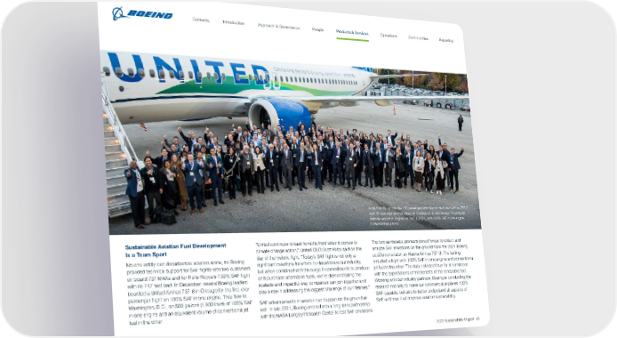 A big thumbs-up from the 100 passengers who flew on the United Airlines 737-8 from O’Hare International Airport in Chicago to Ronald Reagan Washington National Airport in Virginia on Dec. 1, 2021, with 100% SAF in one engine. (United Airlines photo) Sustainable Aviation Fuel Development is a Team Sport No one entity can decarbonize aviation alone, so Boeing provided technical support for SAF flights with two customers on board 737 MAXs and for Rolls-Royce’s 100% SAF flight with its 747 test bed. In December, several Boeing leaders boarded a United Airlines 737-8 in Chicago for the first-ever passenger flight on 100% SAF in one engine. They flew to Washington, D.C., on 500 gallons (1,900 liters) of 100% SAF in one engine and an equivalent volume of conventional jet fuel in the other. “United continues to lead from the front when it comes to climate change action,” United CEO Scott Kirby said on the day of the historic flight. “Today’s SAF flight is not only a significant milestone for efforts to decarbonize our industry, but when combined with the surge in commitments to produce and purchase alternative fuels, we’re demonstrating the scalable and impactful way companies can join together and play a role in addressing the biggest challenge of our lifetimes.” SAF advancements in aviation can happen on the ground as well. In late 2021, Boeing entered into a long-term partnership with the NASA Langley Research Center to test SAF emissions. The two aerospace pioneers joined forces to collect and analyze SAF emissions on the ground from the 2021 Boeing ecoDemonstrator, an Alaska Airlines 737-9. The testing included a flight with 100% SAF in one engine and conventional jet fuel in the other. The data collected thus far is consistent with the expectations of the benefits of the renewable fuel. Working with our industry partners, Boeing is conducting the research not only to make our commercial airplanes 100% SAF-capable, but also to better understand all aspects of SAF and how it will improve aviation sustainability. 2022 Sustainability Report 43 Contents People Introduction Communities Operations Reporting Approach & Governance Products & Services