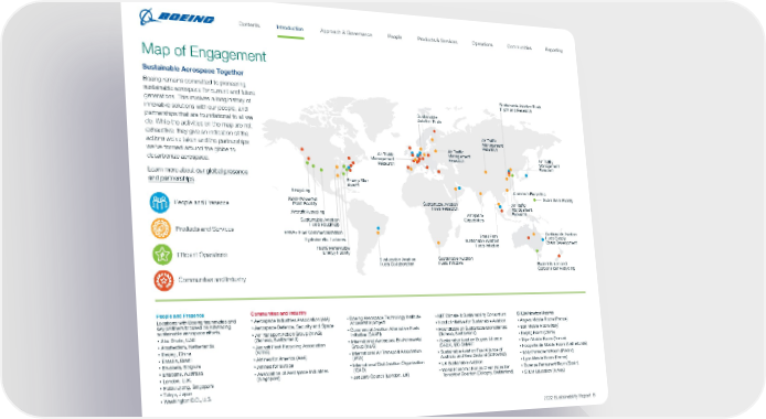 Map of Engagement Sustainable Aerospace Together Boeing remains committed to pioneering sustainable aerospace for current and future generations. This involves a long history of innovative solutions with our people, and partnerships that are foundational to all we do. While the activities on the map are not exhaustive, they give an indication of the actions we’ve taken and the partnerships we’ve formed around the globe to decarbonize aerospace. Learn more about our global presence and partnerships . People and Presence Products and Services Efficient Operations Communities and Industry Recycling Solar-Powered Paint Facility Energy Star Award 100% Renewable Energy Facility Hydrokinetic Turbines Air Trafc Management Research Aircraft Recycling Sustainable Aviation Fuels Supply Chain Development Sustainable Aviation Fuels Initiative Sustainable Aviation Fuels Collaboration Resin Infusion and Carbon Fiber Recycling Guam Solar Facility Aluminum Recycling Sustainable Aviation Fuels Flight and Research Sustainable Aviation Fuels Sustainable Aviation Fuels Roadmap HEFA+ Fuel Commercialization Sustainable Aviation Fuels Research Air Space Capabilities Small Farm Sustainable Aviation Fuels Initiative Air Trafc Management Research Air Trafc Management Research Air Trafc Management Research Air Trafc Management Research People and Presence Locations with Boeing teammates and key partners focused on advancing sustainable aerospace efforts. • Abu Dhabi, UAE • Amsterdam, Netherlands • Beijing, China • Brasilia, Brazil • Brussels, Belgium • Brisbane, Australia • London, U.K. • Pulau Ujong, Singapore • Tokyo, Japan • Washington D.C., U.S. Communities and Industry • Aerospace Industries Association (AIA) • Aerospace Defence, Security and Space • Air Transport Action Group (ATAG) (Geneva, Switzerland) • Aircraft Fleet Recycling Association (AFRA) • Airlines for America (A4A) • Airlines for Europe • Association of Aerospace Industries (Singapore) • Boeing Aerospace Technology Institute Accelerator project • Commercial Aviation Alternative Fuels Initiative (CAAFI) • International Aerospace Environmental Group (IAEG) • International Air Transport Association (IATA) • International Civil Aviation Organization (ICAO) • Jet Zero Council (London, UK) • MIT Climate & Sustainability Consortium • Nordic Initiative for Sustainable Aviation • Roundtable on Sustainable Biomaterials (Geneva, Switzerland) • Sustainable Aviation Buyers Alliance (SABA), BC-SMART • Sustainable Aviation Fuel Alliance of Australia and New Zealand (SAFAANZ) • UK Sustainable Aviation • World Economic Forum Clean Skies for Tomorrow Coalition (Cologny, Switzerland) STEM Newton Rooms • Angers Mobile Room (France) • Bari Mobile Room (Italy) • Beijing Room (China) • Dijon Mobile Room (France) • Hoogerheide Mobile Room (Netherlands) • Łód ź Permanent Room (Poland) • Lyon Mobile Room (France) • Ourense Permanent Room (Spain) • STEM Education (Turkey) Recycling Solar-Powered Paint Facility Energy Star Award 100% Renewable Energy Facility Hydrokinetic Turbines Air Trafc Management Research Aircraft Recycling Sustainable Aviation Fuels Supply Chain Development Sustainable Aviation Fuels Initiative Sustainable Aviation Fuels Collaboration Resin Infusion and Carbon Fiber Recycling Guam Solar Facility Aluminum Recycling Sustainable Aviation Fuels Flight and Research Sustainable Aviation Fuels Sustainable Aviation Fuels Roadmap HEFA+ Fuel Commercialization Sustainable Aviation Fuels Research Air Space Capabilities Small Farm Sustainable Aviation Fuels Initiative Air Trafc Management Research Air Trafc Management Research Air Trafc Management Research Air Trafc Management Research People and Presence Locations with Boeing teammates and key partners focused on advancing sustainable aerospace efforts. • Abu Dhabi, UAE • Amsterdam, Netherlands • Beijing, China • Brasilia, Brazil • Brussels, Belgium • Brisbane, Australia • London, U.K. • Pulau Ujong, Singapore • Tokyo, Japan • Washington D.C., U.S. Communities and Industry • Aerospace Industries Association (AIA) • Aerospace Defence, Security and Space • Air Transport Action Group (ATAG) (Geneva, Switzerland) • Aircraft Fleet Recycling Association (AFRA) • Airlines for America (A4A) • Airlines for Europe • Association of Aerospace Industries (Singapore) • Boeing Aerospace Technology Institute Accelerator project • Commercial Aviation Alternative Fuels Initiative (CAAFI) • International Aerospace Environmental Group (IAEG) • International Air Transport Association (IATA) • International Civil Aviation Organization (ICAO) • Jet Zero Council (London, UK) • MIT Climate & Sustainability Consortium • Nordic Initiative for Sustainable Aviation • Roundtable on Sustainable Biomaterials (Geneva, Switzerland) • Sustainable Aviation Buyers Alliance (SABA), BC-SMART • Sustainable Aviation Fuel Alliance of Australia and New Zealand (SAFAANZ) • UK Sustainable Aviation • World Economic Forum Clean Skies for Tomorrow Coalition (Cologny, Switzerland) STEM Newton Rooms • Angers Mobile Room (France) • Bari Mobile Room (Italy) • Beijing Room (China) • Dijon Mobile Room (France) • Hoogerheide Mobile Room (Netherlands) • Łód ź Permanent Room (Poland) • Lyon Mobile Room (France) • Ourense Permanent Room (Spain) • STEM Education (Turkey) 2022 Sustainability Report 8 Contents People Introduction Communities Operations Reporting Approach & Governance Products & Services