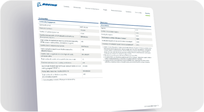 Communities Community Engagement Community giving 1 $187,100,000 Total volunteer hours 290,000 Number of community partners 13,957 Contributions supporting STEM education and workforce development programs $56,300,000 Total number of organizations receiving contributions supporting STEM education and workforce development programs 648 Contributions to veterans organizations $18,700,000 Total organizations receiving contributions supporting veterans programs 416 Contributions to organizations supporting racial equity and social justice $15,300,000 Total number of countries where contributions were made 70 Total international partners receiving contributions 459 Approximate students reached through Boeing's hands-on STEM learning program FUTURE U 645,963 Humanitarian response, including COVID-19 $13,000,000 Total number of contributions supporting environmental programs 482 1. Community giving is inclusive of Boeing and employee giving. Governance Ethics Metrics Inquiries 2,167 Conflict of interest determinations 1,730 Investigative requests 3,503 Total contacts to Ethics & Business Conduct 1 7,400 Investigative requests with enough information to investigate 2 2,896 Percentage of investigated requests that were substantiated 3,4 51% 1. Inquiries comprise Requests for Guidance and Information Requests. Requests for Guidance are situations where employees are seeking guidance when facing ethical dilemmas or when they need assistance in understanding company policies or expected behaviors. Information Requests are situations where employees are seeking general information. Both demonstrate awareness of Boeing’s Compliance and Ethics program, but Requests for Guidance are viewed as the most positive types of contact. 2. Data reflects the reporting period of November 2020 through October 2021. 3. Investigated matters are considered unsubstantiated when the investigation findings do not support a violation of policy or expected behaviors or where there is not sufficient evidence of misconduct. 4. Ongoing evaluations demonstrate that Boeing’s substantiation rate is slightly higher than other published benchmarks, indicating an effective investigation process and informed reporting by company employees. 2022 Sustainability Report 71 Contents People Introduction Communities Operations Reporting Approach & Governance Products & Services