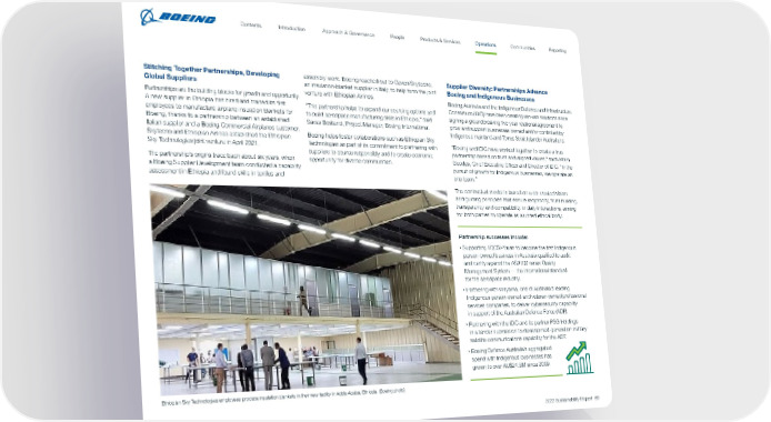 Stitching Together Partnerships, Developing Global Suppliers Partnerships are the building blocks for growth and opportunity. A new supplier in Ethiopia has hired and trained its first employees to manufacture airplane insulation blankets for Boeing, thanks to a partnership between an established Italian supplier and a Boeing Commercial Airplanes customer. Skytecno and Ethiopian Airlines established the Ethiopian Sky Technologies joint venture in April 2021. The partnership’s origins trace back about six years, when a Boeing Supplier Development team conducted a capability assessment in Ethiopia and found skills in textiles and assembly work. Boeing reached out to Geven/Skytecno, an insulation-blanket supplier in Italy, to help form the joint venture with Ethiopian Airlines. “This partnership helps to expand our sourcing options and to build aerospace manufacturing skills in Ethiopia,” said Savas Bostanci, Project Manager, Boeing International. Boeing helps foster collaborations such as Ethiopian Sky Technologies as part of its commitment to partnering with suppliers to source responsibly and to create economic opportunity for diverse communities. Supplier Diversity: Partnerships Advance Boeing and Indigenous Businesses Boeing Australia and the Indigenous Defence and Infrastructure Consortium (iDiC) have been creating win-win solutions since signing a groundbreaking five-year relational agreement to grow and support businesses owned and/or controlled by Indigenous mainland and Torres Strait Islander Australians. “Boeing and iDiC have worked together to create a true partnership based on trust and aligned values,” said Adam Goodes, Chief Executive Officer and Director of iDiC. “In the pursuit of growth for Indigenous businesses, we operate as one team.” The contractual model is based on a co-created vision and guiding principles that ensure reciprocity, trust building, transparency and compatibility in daily interactions, aiming for both parties to operate as a united ethical body. Partnership successes include: • Supporting TQCSI-Yaran to become the first Indigenous person-owned business in Australia qualified to audit and certify against the AS9100 series Quality Management System — the international standard for the aerospace industry. • Partnering with Willyama, one of Australia’s leading Indigenous person-owned and veteran-owned professional services companies, to deliver cybersecurity capability in support of the Australian Defence Force (ADF). • Partnering with the iDiC and its partner PSG Holdings in a tender submission to develop next-generation military satellite communications capability for the ADF. • Boeing Defence Australia’s aggregated spend with Indigenous businesses has grown to over AU$24.5M since 2009. Ethiopian Sky Technologies employees produce insulation blankets in their new facility in Addis Ababa, Ethiopia. (Boeing photo) 2022 Sustainability Report 59 Contents People Introduction Communities Operations Reporting Approach & Governance Products & Services