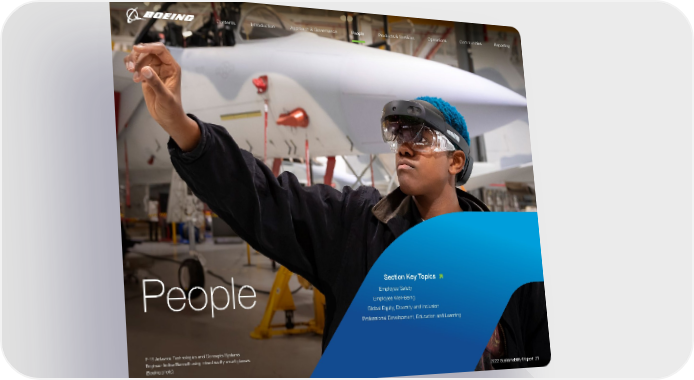 People Section Key Topics Employee Safety Employee Well-Being Global Equity, Diversity and Inclusion Professional Development, Education and Learning F-15 Advance Technologies and Concepts Systems Engineer Indica Bennett using mixed reality smart glasses. (Boeing photo) 2022 Sustainability Report 21 Contents People Introduction Communities Operations Approach & Governance Products & Services Reporting