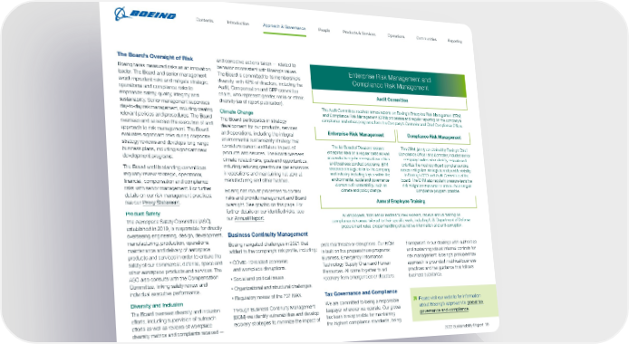 The Board’s Oversight of Risk Boeing takes measured risks as an innovation leader. The Board and senior management avoid imprudent risks and mitigate strategic, operational and compliance risks to emphasize safety, quality, integrity and sustainability. Senior management supervises day-to-day risk management, including creating relevant policies and procedures. The Board oversees and assesses the execution of and approach to risk management. The Board evaluates significant risks during corporate strategy reviews and develops long-range business plans, including significant new development programs. The Board and its standing committees regularly review strategic, operational, financial, compensation and compliance risks with senior management. For further details on our risk management practices, see our Proxy Statement . Product Safety The Aerospace Safety Committee (ASC), established in 2019, is responsible for directly overseeing engineering, design, development, manufacturing, production, operations, maintenance and delivery of aerospace products and services in order to ensure the safety of our commercial, defense, space and other aerospace products and services. The ASC also consults with the Compensation Committee, linking safety review and individual executive performance. Diversity and Inclusion The Board oversees diversity and inclusion efforts, including supervision of outreach efforts as well as reviews of workplace diversity metrics and complaints received — and corrective actions taken — related to behavior inconsistent with Boeing’s values. The Board is committed to its membership’s diversity, with 42% of directors, including the Audit, Compensation and GPP committee chairs, who represent gender, racial or ethnic diversity (as of report publication). Climate Change The Board participates in strategy development for our products, services and operations, including the integral environmental sustainability strategy that considers current and future impact of products and services. The Board oversees climate-related risks, goals and opportunities, including reducing greenhouse gas emissions in operations and maintaining net-zero at manufacturing and other facilities. Boeing has robust processes to control risks and provide management and Board oversight. See graphic on this page. For further details on our identified risks, see our Annual Report . Business Continuity Management Boeing navigated challenges in 2021 that added to the company’s risk profile, including: • COVID-19 related economic and workplace disruptions. • Social and political issues. • Organizational and structural challenges. • Regulatory review of the 737 MAX. Through Business Continuity Management (BCM) we identify vulnerabilities and develop recovery strategies to minimize the impact of potential threats or disruptions. Our BCM is built on five preparedness programs: Business, Emergency, Information Technology, Supply Chain and Human Resources. All come together to aid recovery from emergencies or disasters. Tax Governance and Compliance We are committed to being a responsible taxpayer wherever we operate. Our global tax team is responsible for maintaining the highest compliance standards, being transparent in our dealings with authorities and sustaining robust internal controls for risk management. Boeing’s principled tax approach is grounded in ethical business practices and tax guidance that follows business substance. Please visit our website for information about Boeing’s approach to global tax governance and compliance . Enterprise Risk Management Compliance Risk Management Audit Committee The Audit Committee receives annual reports on Boeing’s Enterprise Risk Management (ERM) and Compliance Risk Management (CRM) processes and regular reporting on the company’s compliance and ethics programs from the Company’s Controller and Chief Compliance Ofcer. Enterprise Risk Management and Compliance Risk Management Annual Employee Training All employees, from senior leaders to new workers, receive annual training on compliance risk areas tailored to their specic work, including U.S. Department of Defense procurement rules, proper handling of sensitive information and anti-corruption. The full Board of Directors reviews enterprise risks on a regular basis as well as conducts regular reviews of our ethics and business conduct programs. ERM assesses strategic risks to the company and industry, including topics within the environmental, social and governance elements of sustainability, such as climate and policy change. The CRM, jointly co-chaired by Boeing’s Chief Compliance Ofcer and Controller, includes senior company leaders who identify, evaluate and prioritize the most signicant compliance risks; assess mitigation strategies; and provide visibility to Boeing’s CEO and Audit Committee of the board. The CRM also regularly pressure-tests the risk mitigation measures to ensure the strongest compliance program possible. 2022 Sustainability Report 16 Contents People Introduction Communities Operations Reporting Approach & Governance Products & Services