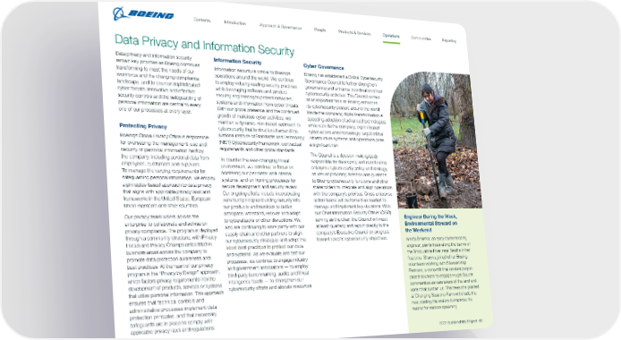 Data Privacy and Information Security Data privacy and information security remain key priorities as Boeing continues transforming to meet the needs of our workforce and the changing compliance landscape, and to counter sophisticated cyber threats. Innovative and effective security controls and the safeguarding of personal information are central to every one of our processes at every layer. Protecting Privacy Boeing’s Global Privacy Office is responsible for overseeing the management, use and security of personal information held by the company, including personal data from employees, customers and suppliers. To manage the varying requirements for safeguarding personal information, we employ a principles-based approach to data privacy that aligns with applicable privacy laws and frameworks in the United States, European Union members and other countries. Our privacy team works across the enterprise to collaborate and advise on privacy compliance. The program is deployed through a community structure, with Privacy Focals and Privacy Champs embedded in business areas across the company to promote data protection awareness and best practices. At the heart of our privacy program is the “Privacy by Design” approach, which factors privacy requirements into the development of products, services or systems that utilize personal information. This approach ensures that technical controls and administrative processes implement data protection principles, and that necessary safeguards are in place to comply with applicable privacy laws and regulations. Information Security Information security is critical to Boeing’s operations around the world. We continue to employ industry-leading security practices while leveraging software and product security engineering to protect networks, systems and information from cyber threats. With our global presence and the continued growth of malicious cyber activities, we maintain a dynamic, risk-based approach to cybersecurity that is structured around the National Institute of Standards and Technology (NIST) Cybersecurity Framework, contractual requirements and other global standards. To counter the ever-changing threat environment, we continue to focus on bolstering our perimeter and internal systems, and on honing processes for secure development and security review. Our ongoing efforts include incorporating zero trust principles building security into our products and services to better anticipate, withstand, recover and adapt to cyberattacks or other disruptions. We also are continuing to work jointly with our supply chain and other partners to align our cybersecurity strategies and adopt the latest best practices to protect our data and systems. As we evaluate and test our processes, we continue to engage industry and government associations — to employ third-party benchmarking, audits and threat intelligence feeds — to strengthen our cybersecurity efforts and allocate resources. Cyber Governance Boeing has established a Global Cybersecurity Governance Council to further strengthen governance and enhance coordination of our cybersecurity activities. The Council comes at an important time as Boeing enhances its cybersecurity posture around the world. Inside the company, digital transformation is speeding adoption of advanced technologies, while outside the company, sophisticated cyber actors who increasingly target critical infrastructure systems and operations pose a significant risk. The Council is a decision-making body responsible for developing and coordinating enterprise cybersecurity policy and strategy, as well as providing direction and guidance to Boeing cybersecurity functions and other stakeholders to integrate and align operations with the company’s priorities. Cross-enterprise action teams will be formed as needed to manage and implement key decisions. With our Chief Information Security Officer (CISO) serving as the chair, the Council will meet at least quarterly and report directly to the company’s Executive Council on progress toward specific cybersecurity objectives. Engineer During the Week, Environmental Steward on the Weekend Ankita Sharma, an early-career Boeing engineer, plants trees along the banks of the Snoqualmie River near Seattle in her free time. Sharma joined other Boeing volunteers working with Stewardship Partners, a nonprofit that creates people- based solutions to engage Puget Sound communities as caretakers of the land and water that sustain us. The trees she planted at Changing Seasons Farm will shade the river, cooling the waters to improve the habitat for salmon spawning. 2022 Sustainability Report 60 Contents People Introduction Communities Operations Reporting Approach & Governance Products & Services