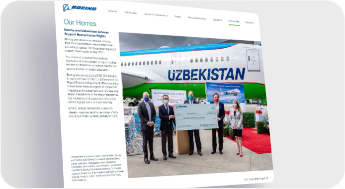 Our Homes Boeing and Uzbekistan Airways Support Humanitarian Flights Boeing and Uzbekistan Airways initiated their third humanitarian delivery flight when the airline’s newest 787 Dreamliner departed Everett, Washington, in May 2021. The shipment included hospital beds, mattresses and wheelchairs to equip medical facilities in Uzbekistan to improve care for the country’s most vulnerable population. Boeing also announced a $100,000 donation to support Project C.U.R.E.’s (Commission on Urgent Relief and Equipment) efforts providing humanitarian medical supplies to Uzbekistan hospitals and medical facilities in the Aral Sea region. People living in this region experience high incidence of diseases and one of the world’s highest rates of infant mortality. In total, Boeing donated $13 million to disaster response and humanitarian efforts, including COVID-19 relief, globally in 2021. Pictured from left: Monte Frazier, Vice President, Russia and Central Asia, Boeing Commercial Airplanes Sales; Javlon Vakhabov, Ambassador of the Republic of Uzbekistan; Bill McSherry, Vice President, Government Operations, Boeing Commercial Airplanes; Dr. Douglas Jackson, Project C.U.R.E. President and CEO; and Melisa Esposti, Project C.U.R.E. Director of Government and NGO Relations. 2022 Sustainability Report 66 Contents People Introduction Communities Operations Reporting Approach & Governance Products & Services