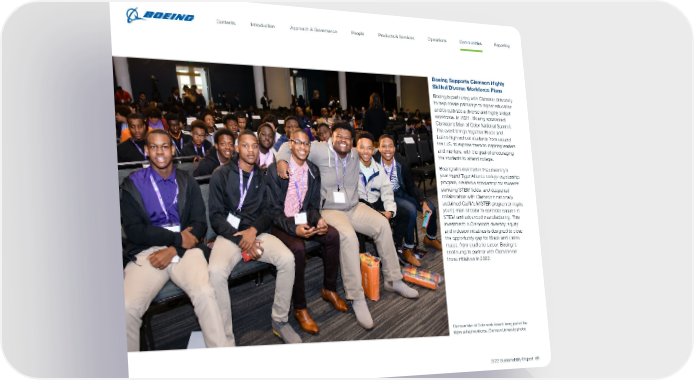 Boeing Supports Clemson Highly Skilled Diverse Workforce Plans Boeing is partnering with Clemson University to help create pathways to higher education and to cultivate a diverse and highly skilled workforce. In 2021, Boeing sponsored Clemson’s Men of Color National Summit. The event brings together Black and Latino high school students from around the U.S. to expose them to inspiring leaders and mentors, with the goal of encouraging the students to attend college. Boeing also invested in the university’s year-round Tiger Alliance college mentorship program, created a scholarship for students pursuing STEM fields, and deepened collaboration with Clemson’s nationally acclaimed Call Me MISTER program to inspire young men of color to consider careers in STEM and advanced manufacturing. This investment in Clemson’s diversity, equity and inclusion initiatives is designed to close the opportunity gap for Black and Latino males, from cradle to career. Boeing is continuing to partner with Clemson on these initiatives in 2022. Clemson Men of Color work toward being part of the highly skilled workforce. (Clemson University photo) 2022 Sustainability Report 65 Contents People Introduction Communities Operations Reporting Approach & Governance Products & Services