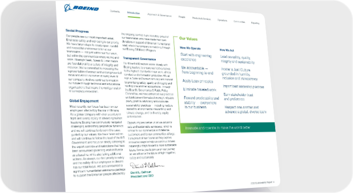 Social Progress Our people are our most important asset. Employee safety and well-being is our priority. We have taken steps to create open, candid and respectful environments for all our teammates — not just within our four walls, but within the communities where we live and work. Boeing’s Seek, Speak & Listen habits are foundational to a culture of integrity and inclusion. We’re committed to increasing the representation of women and underrepresented racial and ethnic minorities at every level of our company. And we continue to invest in our future through technical and educational organizations that inspire the next generation of aerospace innovators. Global Engagement Most recently, our focus has been on our employees affected by the war in Ukraine. As a global company with over a century in flight and a long legacy of advancing human freedom, Boeing has continuously navigated challenging and shifting geopolitical dynamics and we will continue to do so in this case, guided by our values. We have taken action and will continue to follow the lead of the U.S. Government and focus on strictly adhering to the export controls and restrictions that have been announced governing work in Russia as a baseline, while also taking additional actions. As always, our first priority is safety and the safety of our employees in Ukraine has our total focus. We also announced a significant humanitarian assistance package to support the Ukrainian people affected by the ongoing conflict. I am incredibly proud of our teammates who have made their own donations in support of Ukrainian humanitarian relief, which the company is matching through our Boeing Gift Match Program. Transparent Governance Our Board of Directors works closely with Boeing leaders to ensure we hold ourselves to the highest standards in our work, ethical conduct and information protection. We all sign a Code of Conduct annually and commit to prioritizing safety, quality and integrity and holding one another accountable. Through the Board’s Governance & Public Policy Committee, we have enhanced our practices and policies and formalized oversight of public policy, political advocacy and corporate sustainability practices — including matters related to environmental stewardship and climate change, and to diversity, equity and inclusion. Opportunity lies before us as we advance safe and sustainable aerospace, which is critical to our commercial and defense customers and to our communities at large. I am proud of our teams as they explore innovative ways to help us continue to take meaningful steps toward a more sustainable future. I invite you to join us on our journey as we advance the future of flight together, safely and sustainably. David L. Calhoun President and CEO Our Values How We Operate Start with engineering excellence Be accountable — from beginning to end Apply Lean principles Eliminate traveled work Reward predictability and stability — everywhere in our business How We Act Lead on safety, quality, integrity and sustainability Foster a Just Culture grounded in humility, inclusion and transparency Import best leadership practices Earn stakeholder trust and preference Respect one another and advance a global, diverse team Innovate and operate to make the world better 2022 Sustainability Report 4 Contents People Introduction Communities Operations Reporting Approach & Governance Products & Services