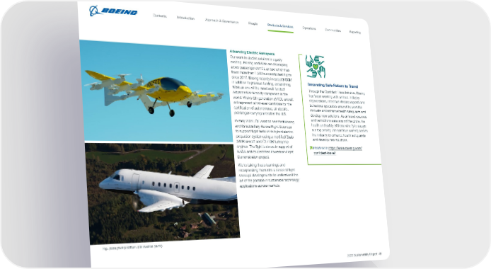 Top: (Wisk photo) Bottom: (GE Aviation photo) Advancing Electric Aerospace Our work in electric aviation is equally exciting. Boeing and Wisk are developing a two-passenger eVTOL air taxi which has flown more than 1,500 successful test flights since 2017. Boeing recently invested $450M in addition to previous funding, establishing Wisk as one of the most well-funded Advanced Air Mobility companies in the world. Wisk’s 6th generation eVTOL aircraft will represent a first-ever candidate for the certification of autonomous, all-electric, passenger-carrying aircraft in the U.S. In early 2022, GE Aviation selected Boeing and its subsidiary Aurora Flight Sciences to support flight tests of its hybrid electric propulsion system using a modified Saab 340B aircraft and CT7-9B turboprop engines. The flight tests are in support of NASA and its Electrified Powertrain Flight Demonstration project. We’re taking these learnings and incorporating them into a series of flight concept developments to understand the art of the possible in sustainable technology applications across markets. Innovating Safe Return to Travel Through the Confident Travel Initiative, Boeing has been working with airlines, industry organizations, infectious disease experts and behavioral specialists around the world to innovate and enhance health safeguards and develop new solutions. As air travel resumes and restrictions ease around the globe, the health and safety of those who fly is always our top priority. We continue working across the industry to enhance health safeguards and develop new solutions. Read more https://www.boeing.com/ confident-travel/ 2022 Sustainability Report 46 Contents People Introduction Communities Operations Reporting Approach & Governance Products & Services