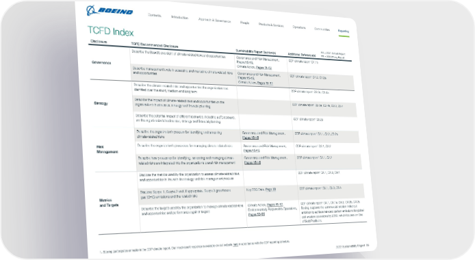 TCFD Index Disclosure TCFD Recommended Disclosure Sustainability Report Section(s) Additional Reference(s) Governance Describe the Board’s oversight of climate-related risks and opportunities Governance and Risk Management, Pages 15-16 ; Climate Action, Pages 51-52 CDP climate report 1 C1.1b Describe management’s role in assessing and managing climate-related risks and opportunities Governance and Risk Management, Pages 15-16 ; Climate Action, Pages 51-52 CDP climate report 1 C1.2, C1.2a Strategy Describe the climate-related risks and opportunities the organization has identified over the short, medium and long term CDP climate report 1 C2.3a, C2.4a Describe the impact of climate-related risks and opportunities on the organization’s businesses, strategy and financial planning CDP climate report 1 C2.3a, C2.4a, C3.3, C3.4 Describe the potential impact of different scenarios, including a 2 ̊C scenario, on the organization’s businesses, strategy and financial planning CDP climate report 1 C3.2a Risk Management Describe the organization’s process for identifying and assessing climate-related risks Governance and Risk Management, Pages 15-16 CDP climate report 1 C2.1, C2.2, C2.2a Describe the organization’s processes for managing climate-related risks Governance and Risk Management, Pages 15-16 CDP climate report 1 C2.1, C2.2 Describe how processes for identifying, assessing and managing climate- related risks are integrated into the organization’s overall risk management Governance and Risk Management, Pages 15-16 CDP climate report 1 C2.1, C2.2 Metrics and Targets Disclose the metrics used by the organization to assess climate-related risks and opportunities in line with its strategy and risk-management process CDP climate report 1 C4.1, C4.2, C9.1 Disclose Scope 1, Scope 2 and, if appropriate, Scope 3 greenhouse gas (GHG) emissions and the related risks Key ESG Data, Page 68 CDP climate report 1 C6.1, C6.3, C6.5 Describe the targets used by the organization to manage climate-related risks and opportunities and performance against targets Climate Action, Pages 51-52 ; Environmentally Responsible Operations, Pages 53-55 CDP climate report 1 C4.1, C4.1a, C4.2, C4.2b, C4.2c Boeing supports the commercial aviation industry’s ambition to achieve net-zero carbon emissions for global civil aviation operations by 2050, which focuses on Use of Sold Products. AR = 2021 Annual Report PR = 2022 Proxy Report 1. Boeing participates annually in the CDP climate report. Our most recent response is available on our website here in accordance with the CDP reporting schedule. 2022 Sustainability Report 84 Contents People Introduction Communities Operations Reporting Approach & Governance Products & Services
