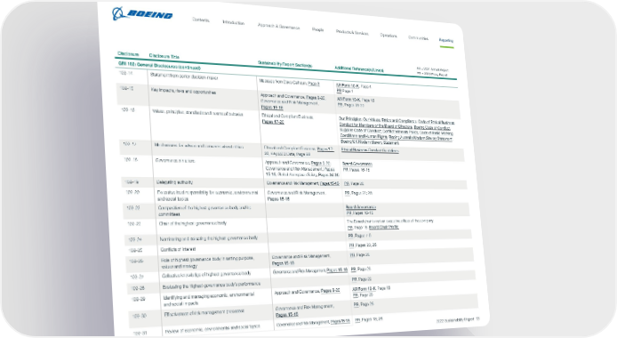 Disclosure Disclosure Title Sustainability Report Section(s) Additional Reference(s)/Link(s) GRI 102: General Disclosures (continued) 102-14 Statement from senior decision-maker Message from Dave Calhoun, Page 3 AR Form 10-K , Page 4 PR Page 1 102-15 Key impacts, risks and opportunities Approach and Governance, Pages 9-20 ; Governance and Risk Management, Pages 15-16 AR Form 10-K , Page 18 PR , Pages 28-33 102-16 Values, principles, standards and norms of behavior Ethical and Compliant Business, Pages 17-20 Our Principles ; Our Values ; Ethics and Compliance ; Code of Ethical Business Conduct for Members of the Board of Directors ; Boeing Code of Conduct ; Supplier Code of Conduct ; Conflict Minerals Policy ; Code of Basic Working Conditions and Human Rights ; Boeing Australia Modern Slavery Statement ; Boeing UK Modern Slavery Statement 102-17 Mechanisms for advice and concerns about ethics Ethical and Compliant Business, Pages 17- 20 ; Key ESG Data, Page 68 Ethical Business Conduct Guidelines 102-18 Governance structure Approach and Governance, Pages 9-20 ; Governance and Risk Management, Pages 15-16 ; Global Aerospace Safety, Pages 34-36 Board Governance PR , Pages 16-18 102-19 Delegating authority Governance and Risk Management, Pages 15-16 PR , Page 28 102-20 Executive-level responsibility for economic, environmental and social topics Governance and Risk Management, Pages 15-16 PR , Pages 21; 28 102-22 Composition of the highest governance body and its committees Board Governance PR , Pages 16-18 102-23 Chair of the highest governance body The Board chair is not an executive officer of the company. PR , Page 16; Board Chair Profile 102-24 Nominating and selecting the highest governance body PR , Pages 7-8 102-25 Conflicts of interest PR , Pages 23; 26 102-26 Role of highest governance body in setting purpose, values and strategy Governance and Risk Management, Pages 15-16 PR , Page 28 102-27 Collective knowledge of highest governance body Governance and Risk Management, Pages 15-16 PR , Page 28 102-28 Evaluating the highest governance body’s performance PR , Page 22 102-29 Identifying and managing economic, environmental and social impacts Approach and Governance, Pages 9-20 AR Form 10-K , Page 18 PR , Page 28 102-30 Effectiveness of risk management processes Governance and Risk Management, Pages 15-16 PR , Page 28 102-31 Review of economic, environmental and social topics Governance and Risk Management, Pages 15-16 PR , Pages 18; 28 AR = 2021 Annual Report PR = 2022 Proxy Report 2022 Sustainability Report 73 Contents People Introduction Communities Operations Reporting Approach & Governance Products & Services