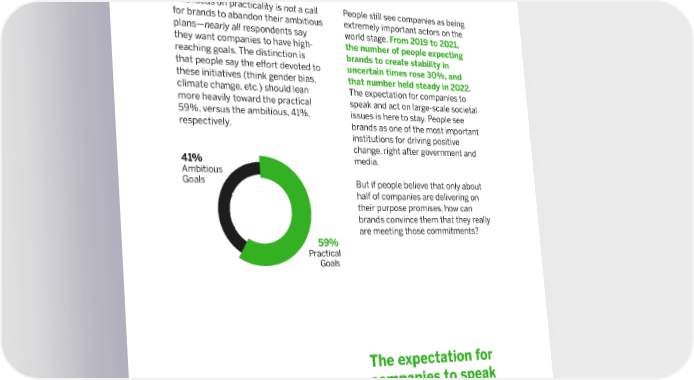 People still see companies as being extremely important actors on the world stage. From 2019 to 2021, the number of people expecting brands to create stability in uncertain times rose 30%, and that number held steady in 2022. The expectation for companies to speak and act on large-scale societal issues is here to stay. People see brands as one of the most important institutions for driving positive change, right after government and media. But if people believe that only about half of companies are delivering on their purpose promises, how can brands convince them that they really are meeting those commitments? This focus on practicality is not a call for brands to abandon their ambitious plans— nearly all respondents say they want companies to have high- reaching goals. The distinction is that people say the effort devoted to these initiatives (think gender bias, climate change, etc.) should lean more heavily toward the practical 59%, versus the ambitious, 41%, respectively. The expectation for companies to speak and act on large-scale issues is here to stay. 59 % Practical Goal s 41 % Ambitious Goals 12