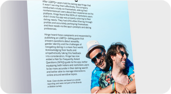 26 After LGBTQ+ users told the dating app Hinge that it wasn’t serving them effectively, the company conducted a study on themselves, asking their nonheterosexual users about their experience on the platform. Hinge found that 80% of nonhetero users didn’t think the app was properly catering to their dating needs. They had difficulties filtering through profiles and accurately portraying themselves and their needs via the app’s prompts and dating preferences. Hinge heard these complaints and responded by publishing an LGBTQ+ dating guide that answers questions about sexuality, gender identity and the challenges of navigating dating in a more fluid world. Acknowledging their faults and empathetically taking this feedback into consideration, Hinge has now added a Not-So-Frequently Asked Questions (NFAQ) guide to the app, better equipping both hetero and nonhetero users to be more accurate in their dating search and better able to manage interactions online around sensitive topics. Note: Case studies are based on outside reporting and were not part of the Brands in Motion survey. Case Study: 26