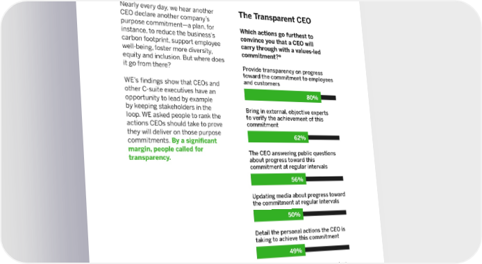 Nearly every day, we hear another CEO declare another company’s purpose commitment—a plan, for instance, to reduce the business’s carbon footprint, support employee well-being, foster more diversity, equity and inclusion. But where does it go from there? WE’s findings show that CEOs and other C-suite executives have an opportunity to lead by example by keeping stakeholders in the loop. WE asked people to rank the actions CEOs should take to prove they will deliver on those purpose commitments. By a significant margin, people called for transparency. The Transparent CEO Which actions go furthest to convince you that a CEO will carry through with a values-led commitment?* 18 Provide transparency on progress toward the commitment to employees and customers Bring in external, objective experts to verify the achievement of this commitmen t The CEO answering public questions about progress toward this commitment at regular interval s Updating media about progress toward the commitment at regular interval s Detail the personal actions the CEO is taking to achieve this commitment 49% 50 % 56% 62 % 80 % *Survey respondents were asked to rank up to three.