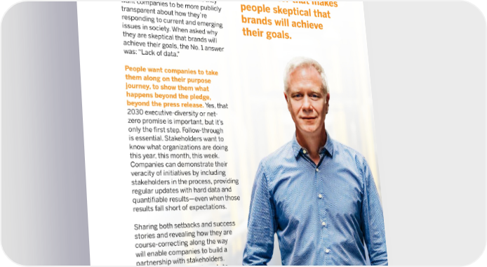 13 The answer is loud and clear: Show your work and share the journey. Seventy-four percent of our consumer respondents tell us they want companies to be more publicly transparent about how they’re responding to current and emerging issues in society. When asked why they are skeptical that brands will achieve their goals, the No. 1 answer was: “Lack of data.” People want companies to take them along on their purpose journey, to show them what happens beyond the pledge, beyond the press release. Yes, that 2030 executive-diversity or net- zero promise is important, but it’s only the first step. Follow-through is essential. Stakeholders want to know what organizations are doing this year, this month, this week. Companies can demonstrate their veracity of initiatives by including stakeholders in the process, providing regular updates with hard data and quantifiable results—even when those results fall short of expectations. Sharing both setbacks and success stories and revealing how they are course-correcting along the way will enable companies to build a partnership with stakeholders. People are rooting for brands to succeed, and they want an up- close view of the progress. “Lack of data” is the No. 1 factor that makes people skeptical that brands will achieve their goals. 13
