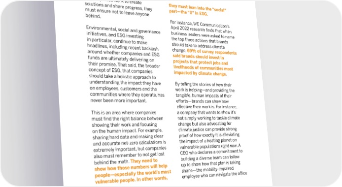 21 As companies work to create solutions and share progress, they must ensure not to leave anyone behind. Environmental, social and governance initiatives, and ESG investing in particular, continue to make headlines, including recent backlash around whether companies and ESG funds are ultimately delivering on their promise. That said, the broader concept of ESG, that companies should take a holistic approach to understanding the impact they have on employees, customers and the communities where they operate, has never been more important. This is an area where companies must find the right balance between showing their work and focusing on the human impact. For example, sharing hard data and making clear and accurate net-zero calculations is extremely important, but companies also must remember to not get lost behind the math. They need to show how those numbers will help people—especially the world’s most vulnerable people. In other words, they must lean into the “social” part—the “S” in ESG. For instance, WE Communication’s April 2022 research finds that when business leaders were asked to name the top three actions that brands should take to address climate change, 69% of survey respondents said brands should invest in projects that protect jobs and livelihoods of communities most impacted by climate change. By telling the stories of how their work is helping—and providing the tangible, human impacts of their efforts—brands can show how effective their work is. For instance, a company that wants to show it’s not simply working to tackle climate change but also advocating for climate justice can provide strong proof of how exactly it is alleviating the impact of a heating planet on vulnerable populations right now . A CEO who declares a commitment to building a diverse team can follow up to show how that plan is taking shape—the mobility-impaired employee who can navigate the office