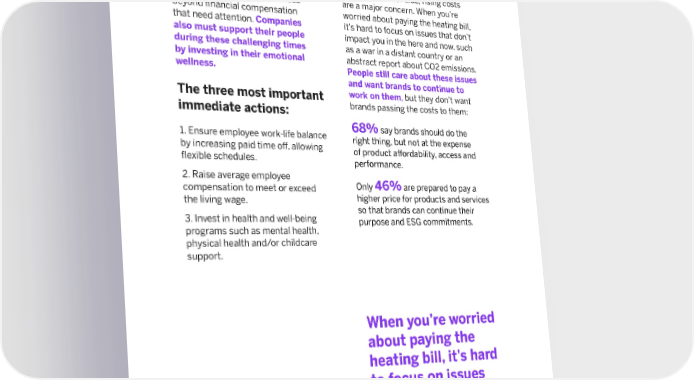 8 Regarding employees, WE’s findings reveal other quality-of life issues beyond financial compensation that need attention. Companies also must support their people during these challenging times by investing in their emotional wellness. The three most important immediate actions: 1. Ensure employee work-life balance by increasing paid time off, allowing flexible schedules. 2. Raise average employee compensation to meet or exceed the living wage. 3. Invest in health and well-being programs such as mental health, physical health and/or childcare support. On the consumer side, rising costs are a major concern. When you’re worried about paying the heating bill, it’s hard to focus on issues that don’t impact you in the here and now, such as a war in a distant country or an abstract report about CO2 emissions. People still care about these issues and want brands to continue to work on them , but they don’t want brands passing the costs to them: 68% say brands should do the right thing, but not at the expense of product affordability, access and performance. Only 46% are prepared to pay a higher price for products and services so that brands can continue their purpose and ESG commitments. When you’re worried about paying the heating bill, it’s hard to focus on issues that don’t impact you in the here and now.
